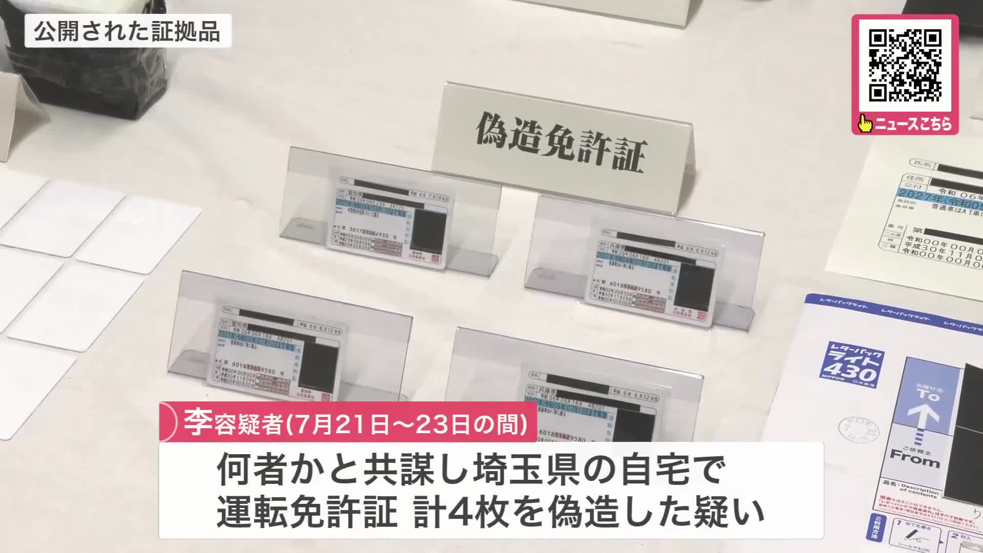 李容疑者は、7月21日から23日までの間、何者かと共謀し、埼玉県内の自宅で運転免許証4枚を偽造した疑いがもたれています。