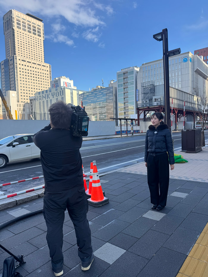 新ホテルの取材で誠実にリポート。目の前のJRタワーとほぼ同い年の板橋アナ(驚き)