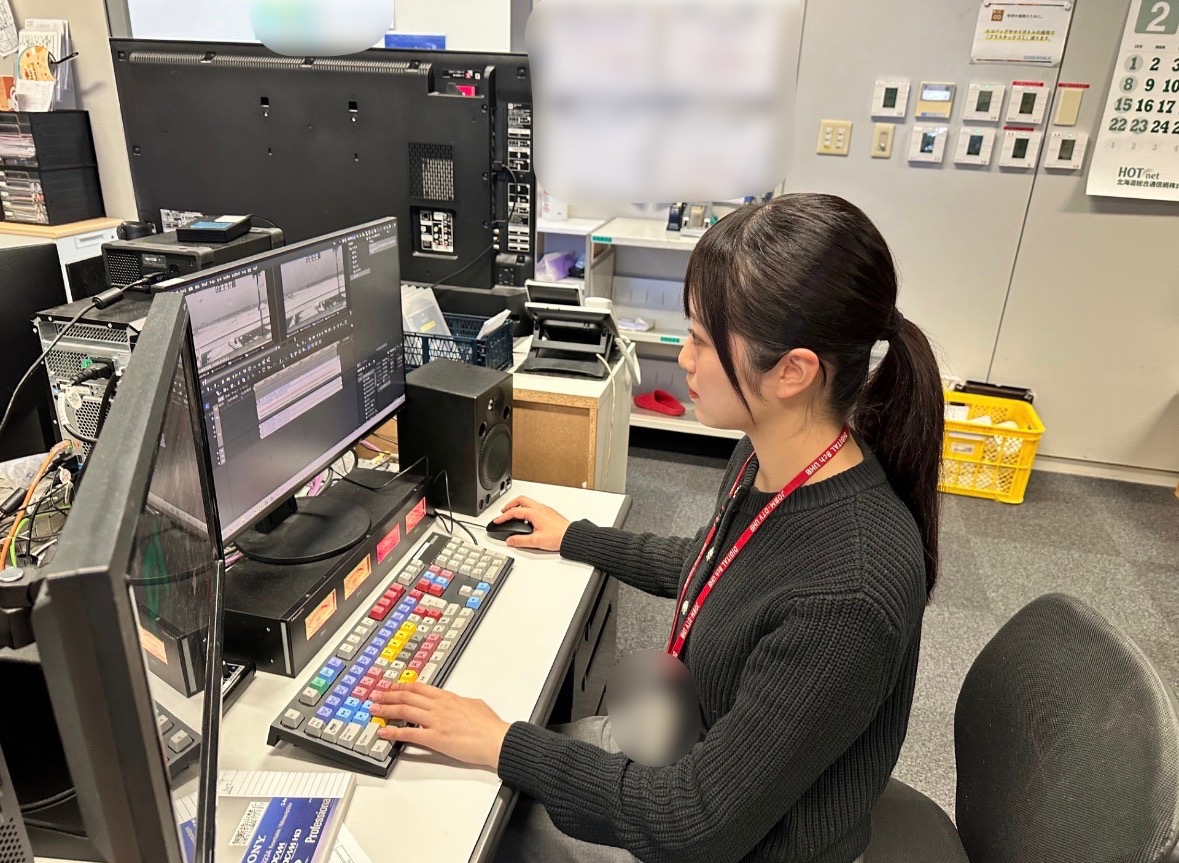 記者とアナウンサーの二足の草鞋で活躍する八木アナ。 編集作業に立ち会う真剣な面持ちをキャッチ。