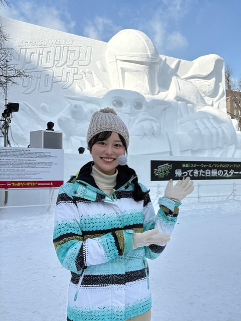 千須和アナから借りたスキーウェアで雪まつり中継をやり遂げた板橋未悠アナ。先輩パワーが込められています!