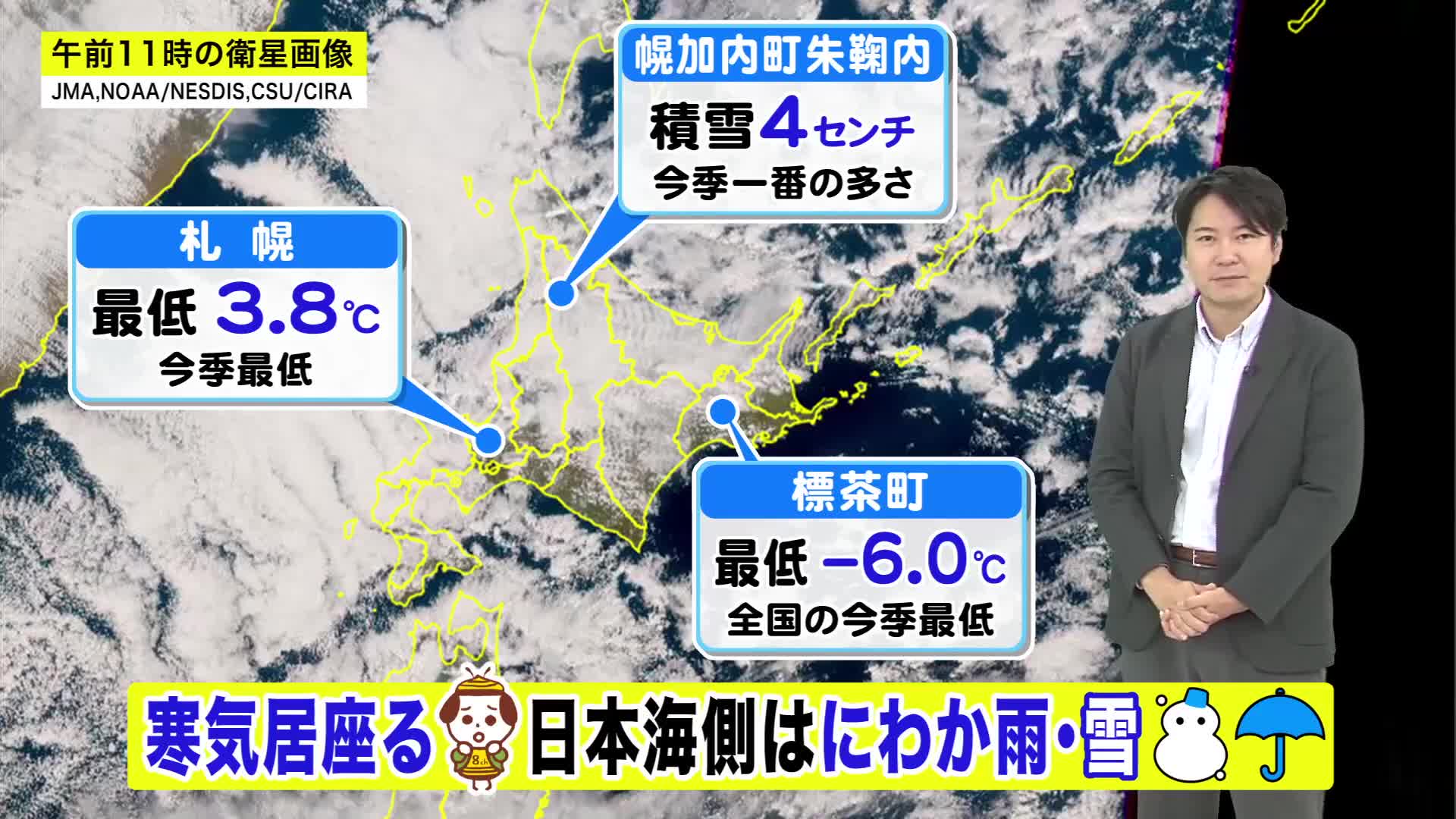(吉井庸二気象予報士が解説) 午前11時50分現在 ◆強い寒気居座る 道内は、きょう21日(火)も強い寒気の影響で、日本海では雨雲や雪雲が発達しています。 昨夜は日本海側を中心に雪が降り、 幌加内町朱鞠内では、積雪が4センチとなりました。 一方、晴れた太平洋側は冷え込みが強まりました。 標茶町は、今季全国で最も低い-6.0℃を観測し、 札幌では3.8℃と、今季一番の冷え込みになっています。 ◆きょう2…