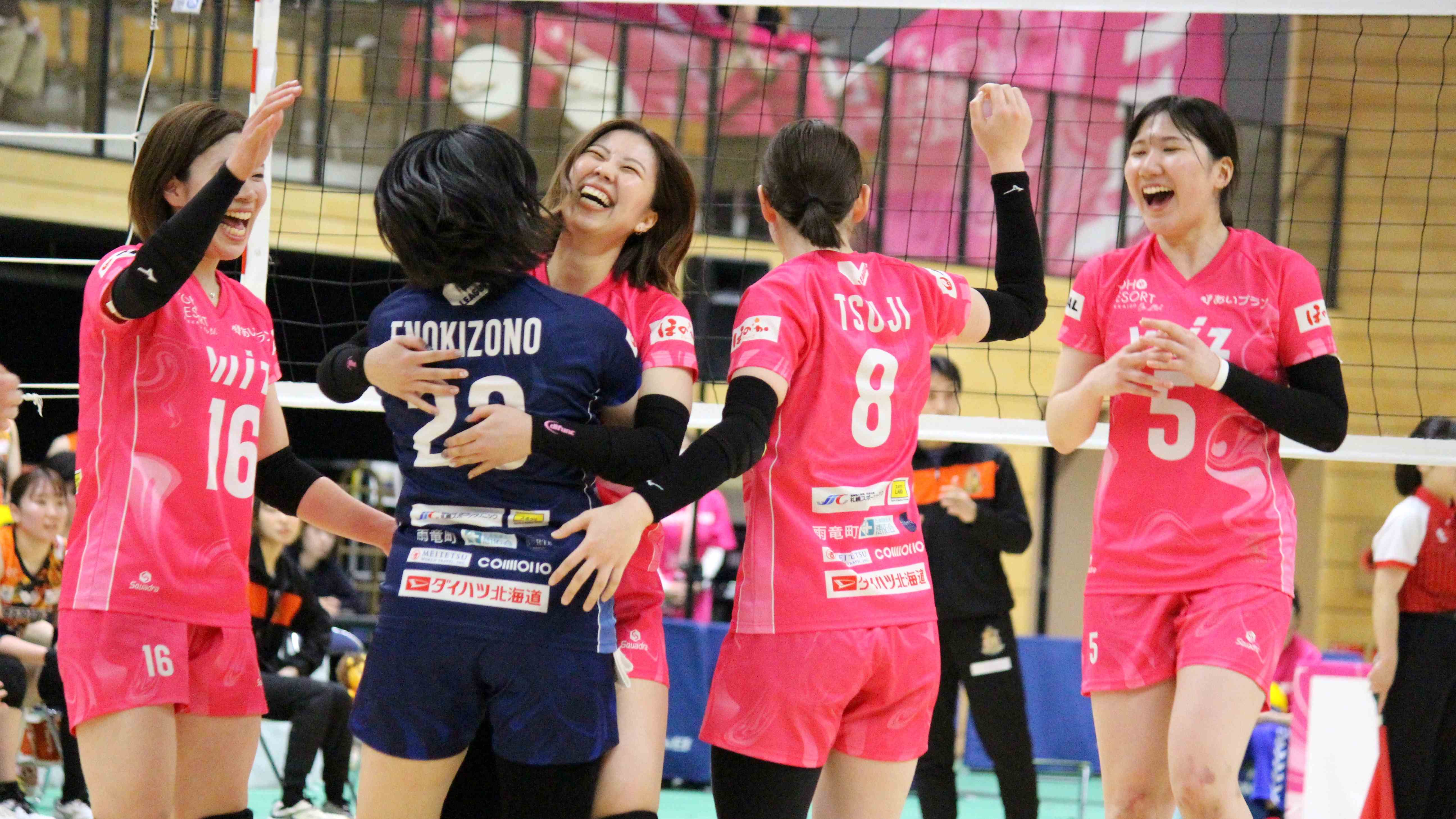 サービスエースを決めた岩見花選手(中央)とチームメート