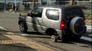 タイヤが脱落した軽乗用車は車体の一部が壊れましたが、乗っていた女性は無事でした。