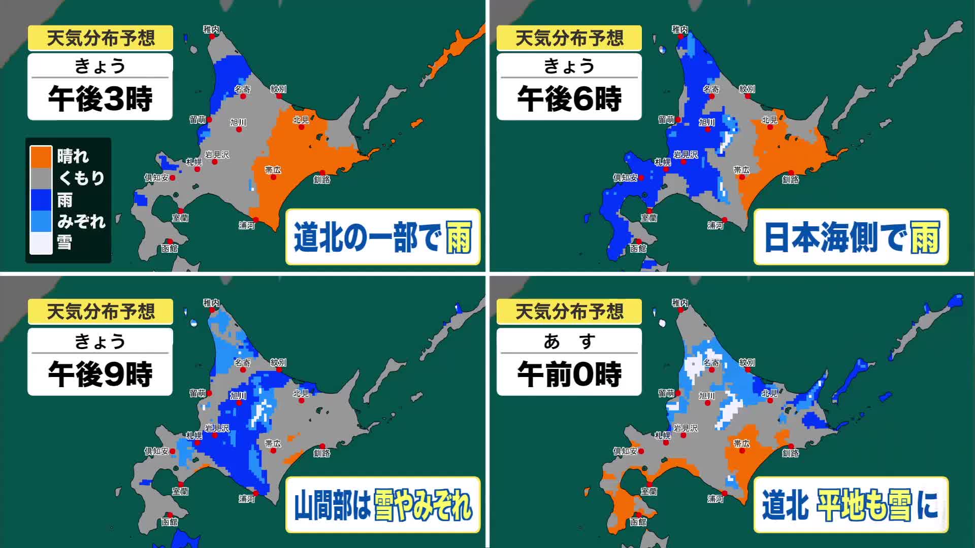 あす13日(水)午前0時には、道北の平地でも雪が降りそうです。