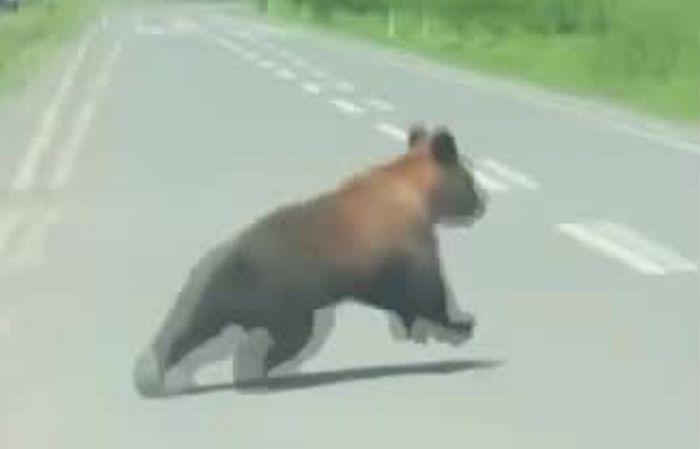 歩道を歩く男性を追い掛けようとするクマの姿をカメラが捉えました。