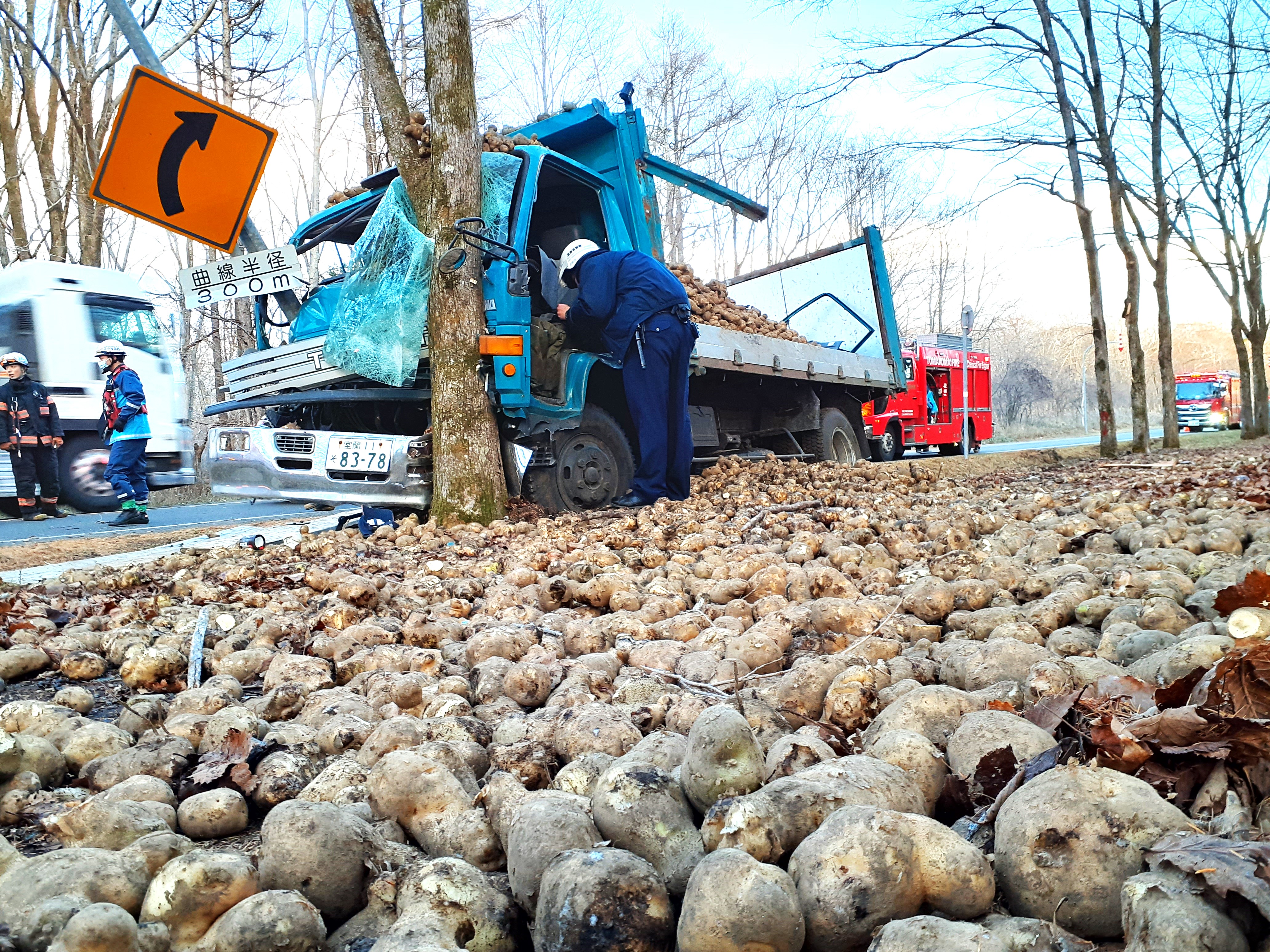 荷台に積まれていた大量のジャガイモが道路わきに散乱 トラックが標識と立木に衝突 運転手の男性は一時閉じ込められるも軽傷 北海道苫小牧市