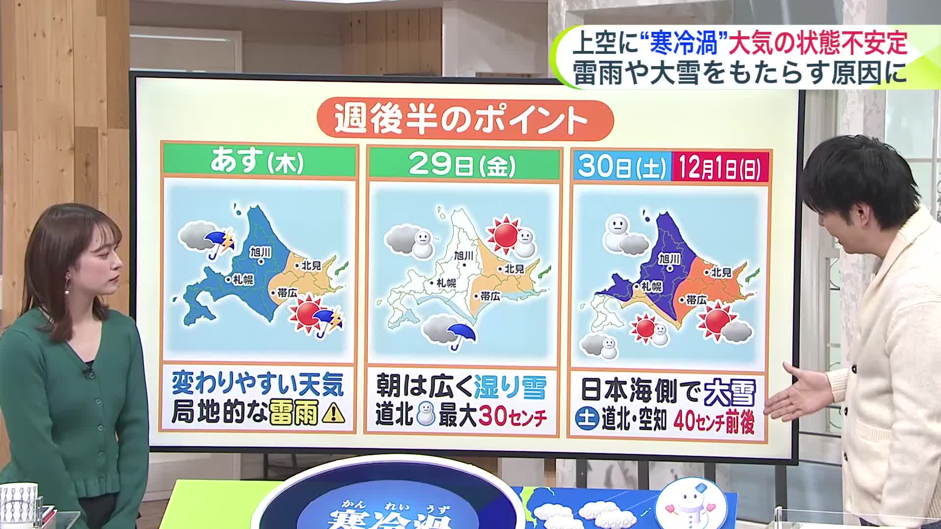 北海道【吉井さんの天気予報 11/27(水)】あすも大気の状態不安定…雷雨や竜巻に注意を!週末は寒気流入 道北は本格的な冬のスタート