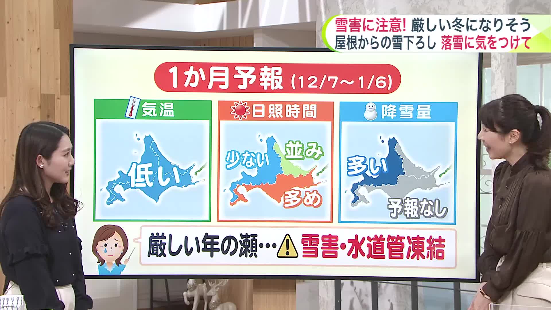 平均気温は全道的に低く、日本海側の降雪量は多い予報が出ています。