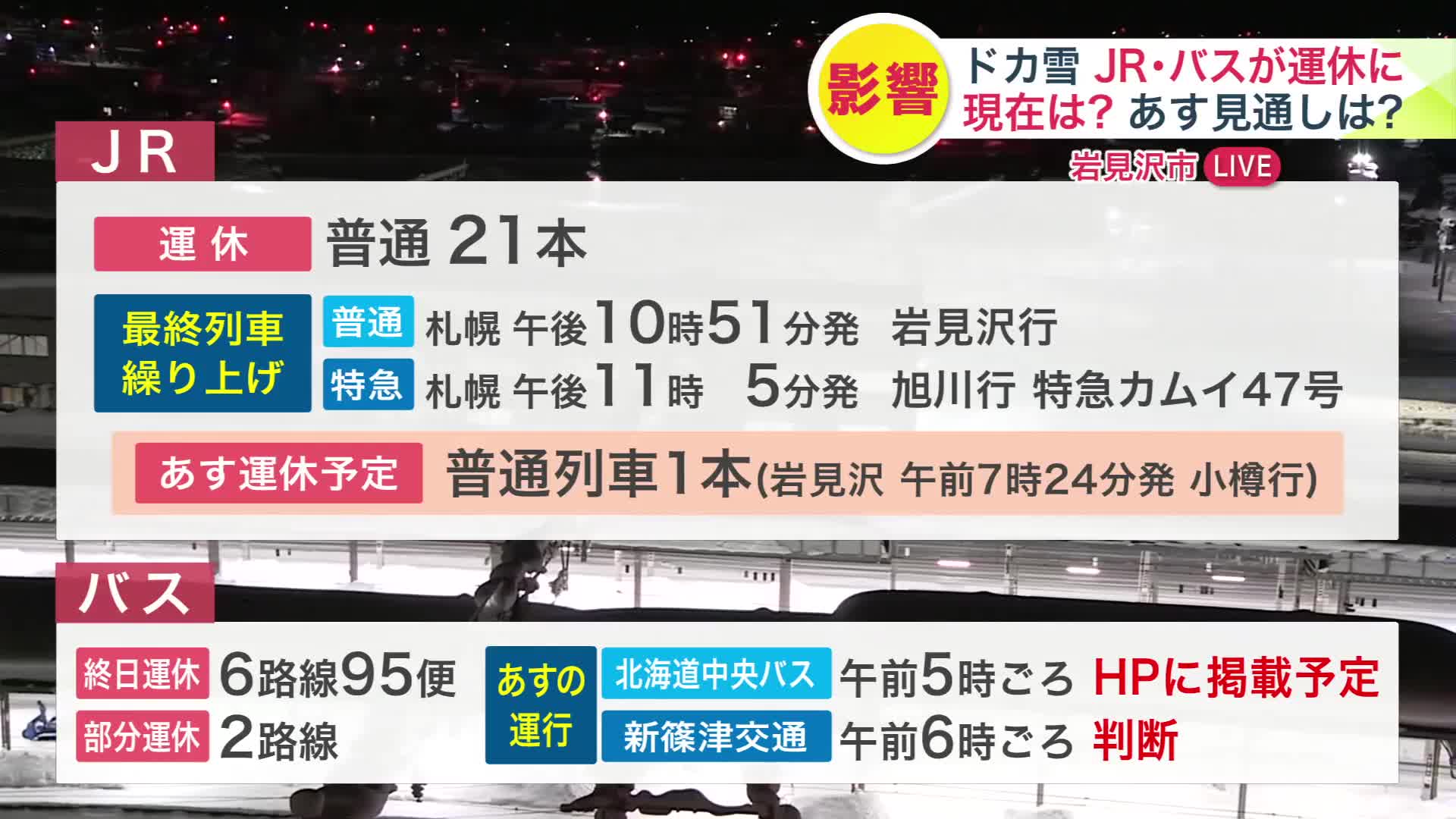 【交通情報】駅の除雪時間を確保するため札幌から岩見沢方面に向かう最終列車が"1時間繰り上げ"…バス運行は6路線95便が運休…19日も影響続く見込み 北海道岩見沢市
