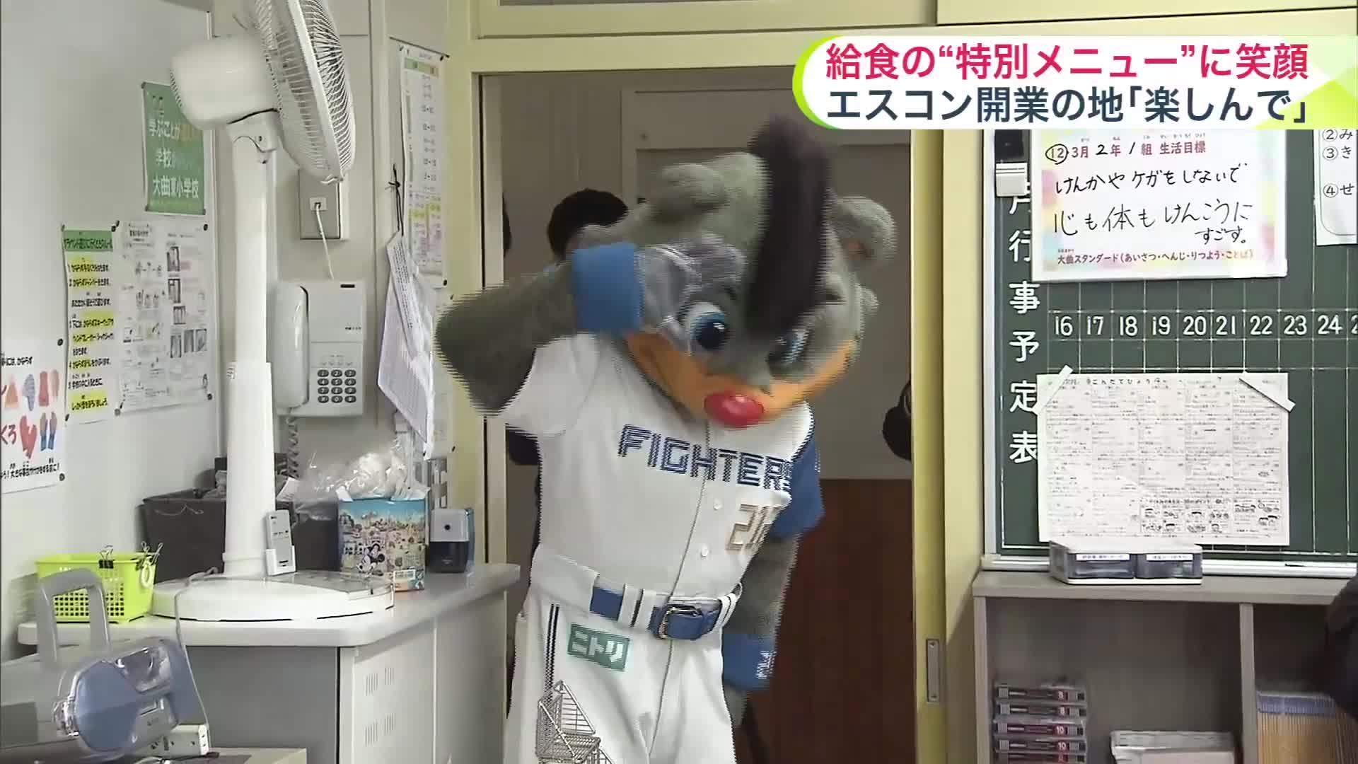 北広島市の大曲東小学校に現れたのは、北海道日本ハムファイターズのマスコットキャラクターB・B。子どもたちに日本ハムのソーセージを代表するシャウエッセンを配りました。