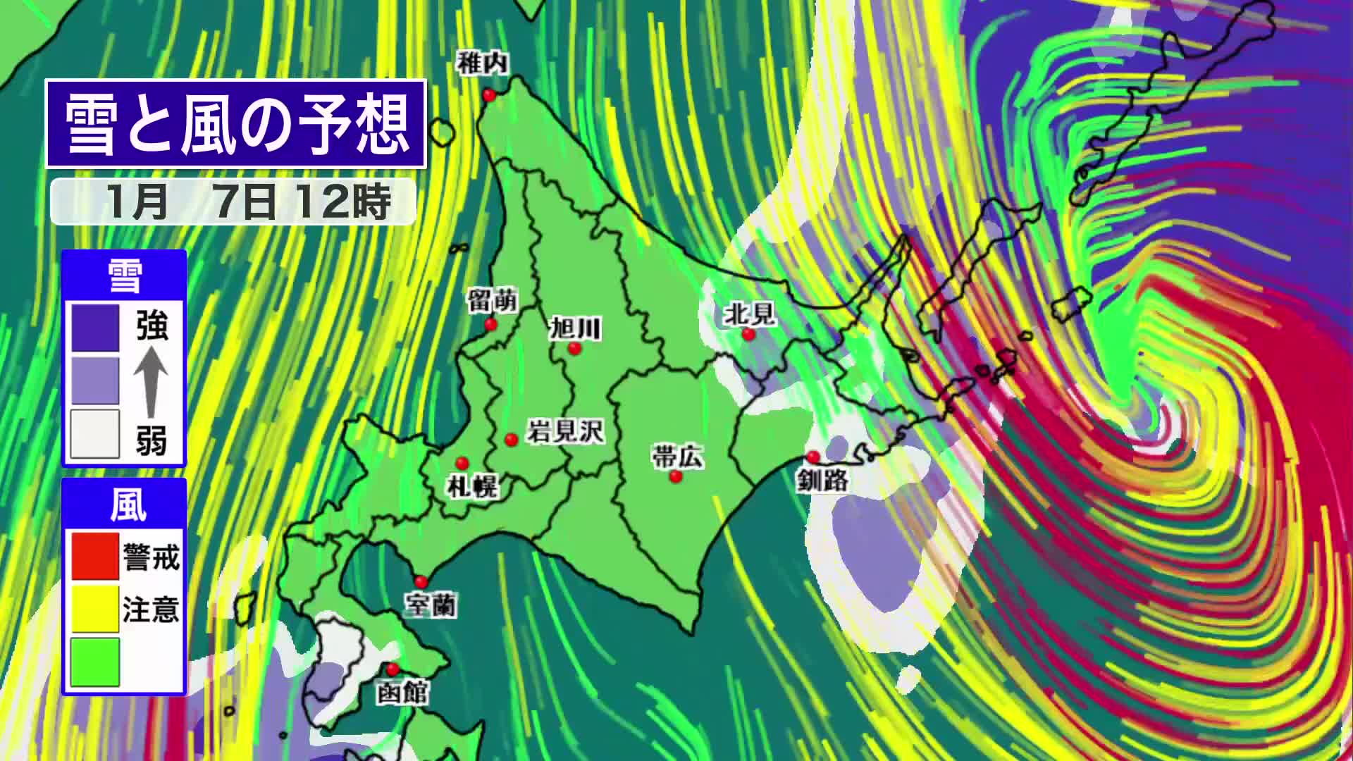 根室は風速20メートル以上【北海道の天気 1/7(火)】北海道の東で低気圧が発達…道東は夕方にかけて大雪・吹雪に注意!あすは日本海側で猛吹雪も