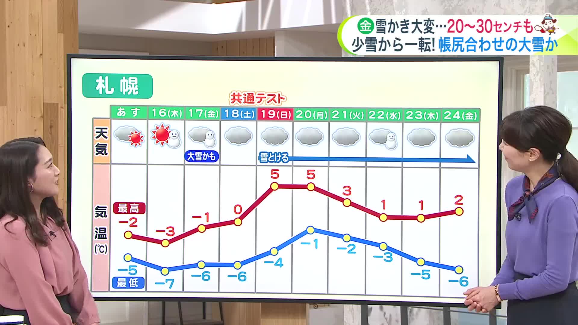今季一番の大雪のおそれ【北海道の天気 1/14(火)】17日(金)は札幌など道央圏で積雪が急増・・・共通テストの影響は?最新の週間予報