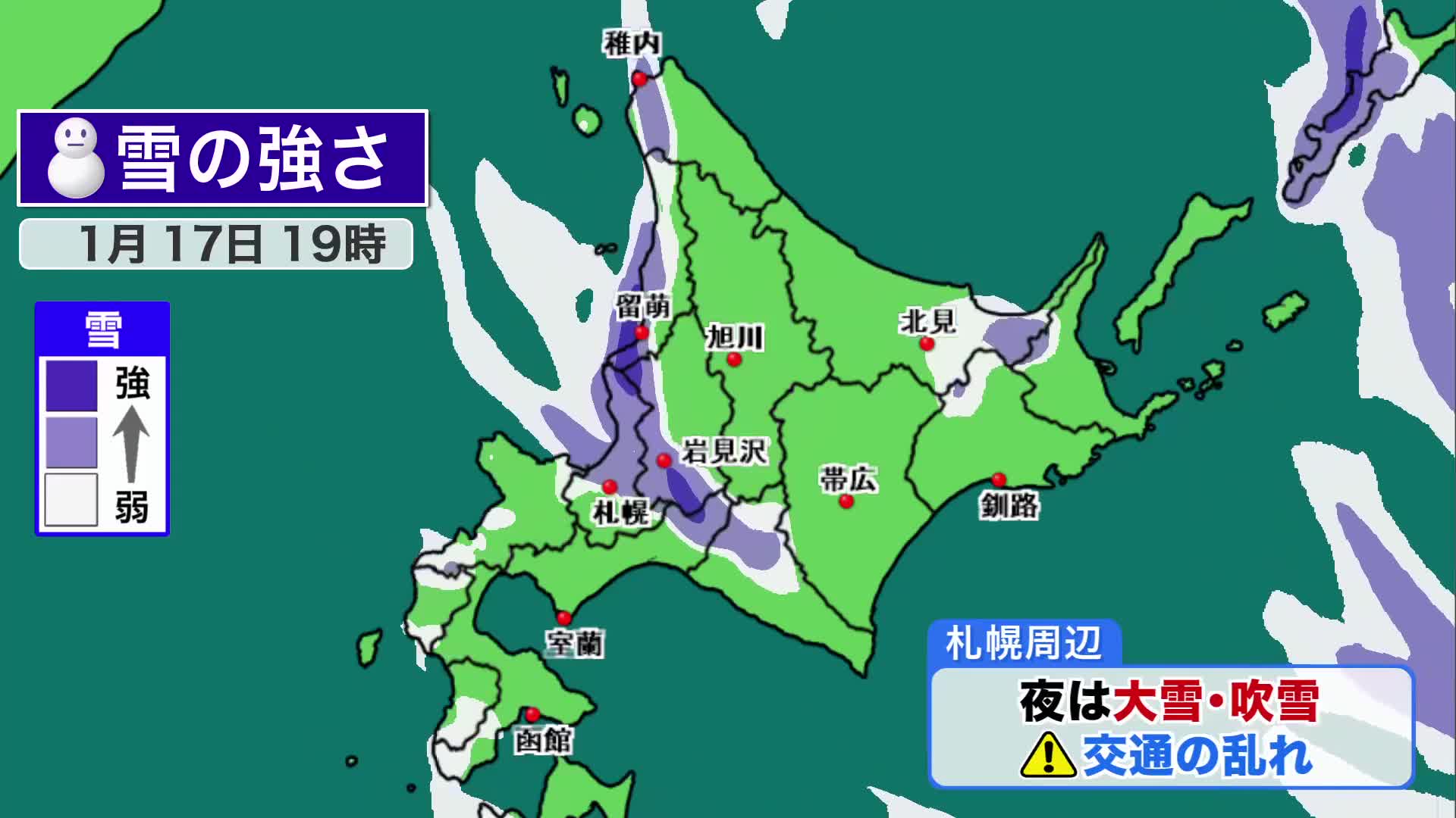 今夜は交通機関に乱れも【北海道の天気 1/17(金)】日本海側南部は昼過ぎ~夜遅く 大雪ピーク!札幌も積雪が急増