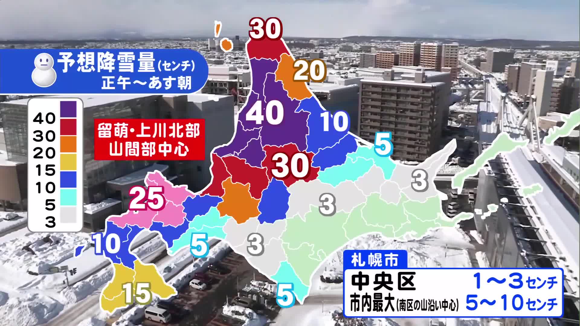 上川北部や留萌地方の山間部を中心に最大40センチの予想です。