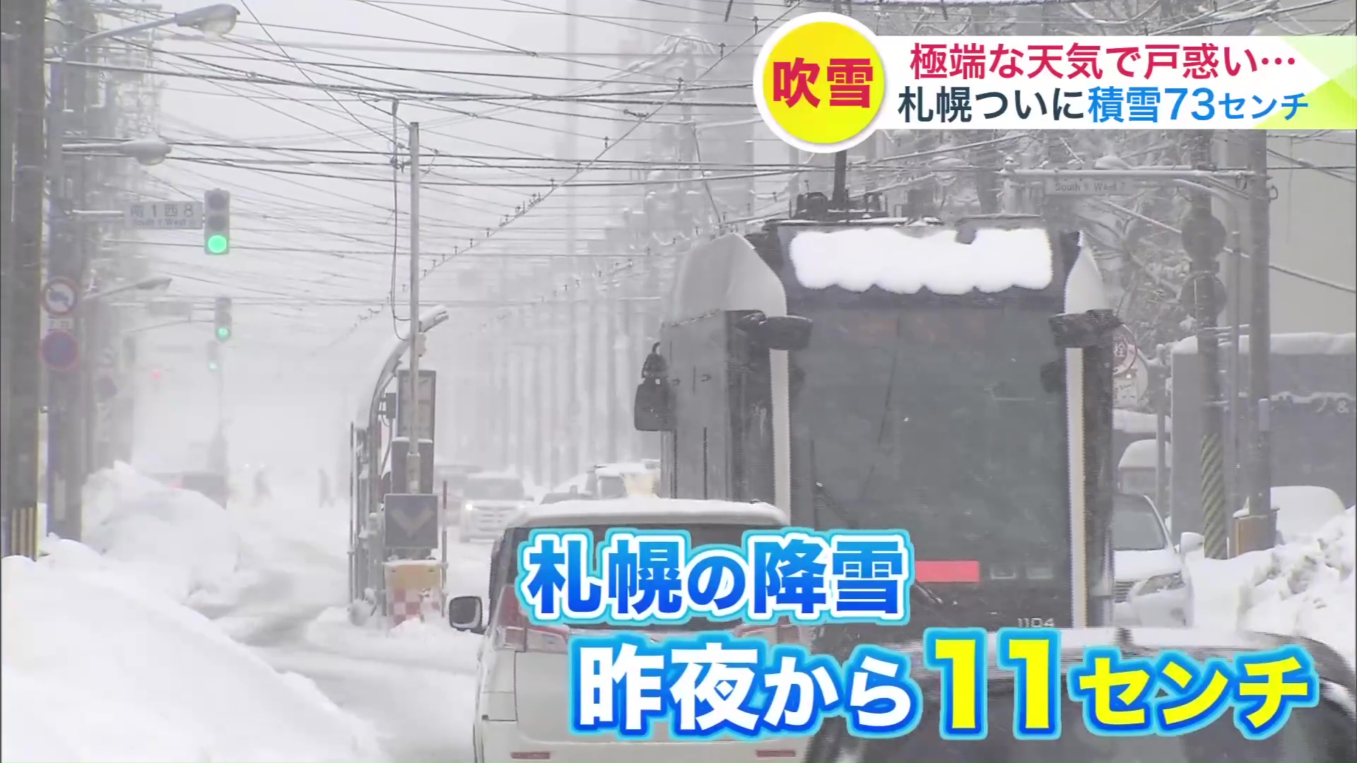 【気温乱高下】積雪も帳尻合って73センチに…札幌は3月中旬並みの暖かさから一転して吹雪…路面は”水たまり→圧雪→凍結”に変化で市民も困惑 北海道札幌市