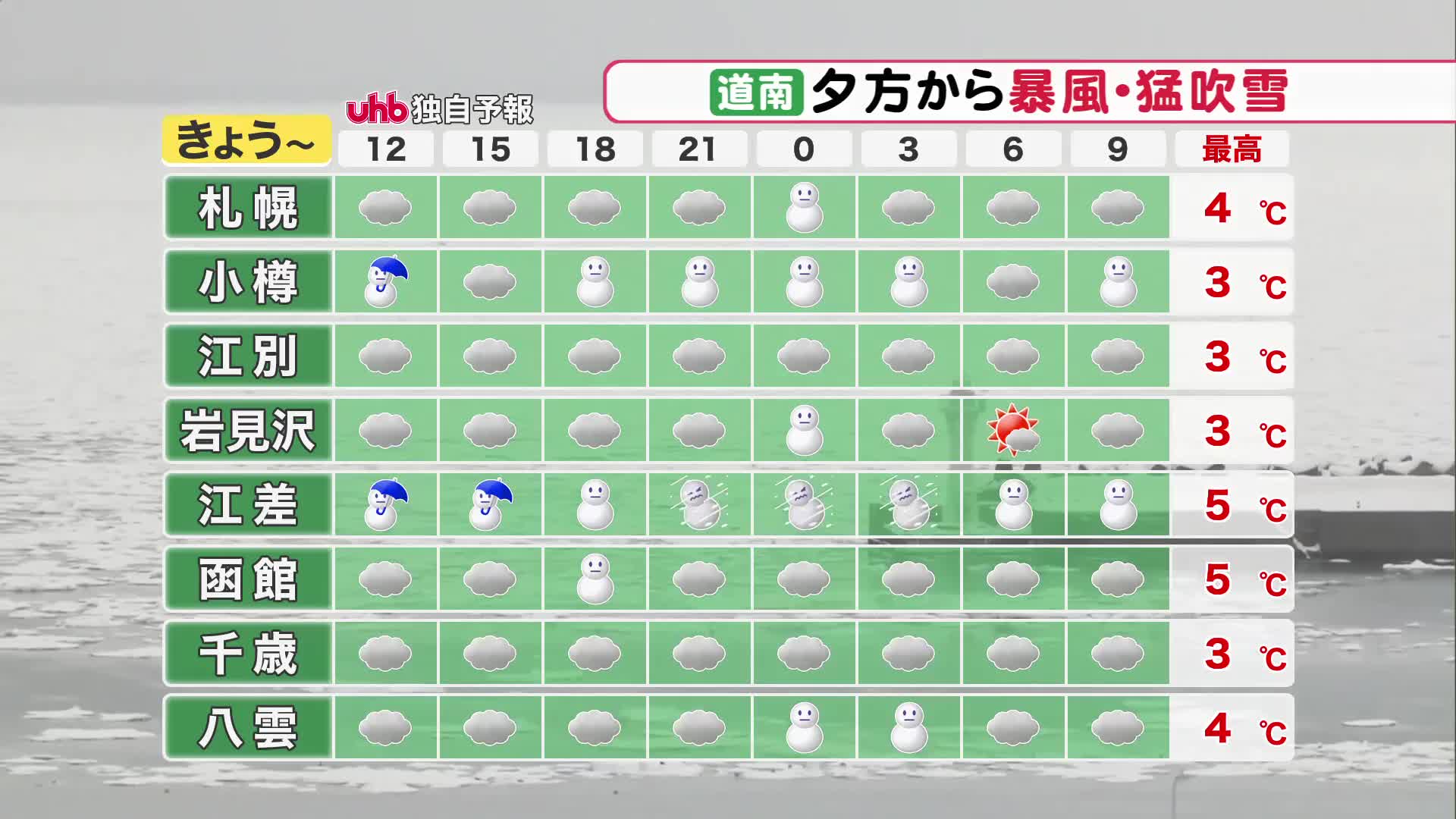 夕方以降は、道南で大荒れとなり、雪と風が強まり、猛吹雪や暴風に警戒レベルです。