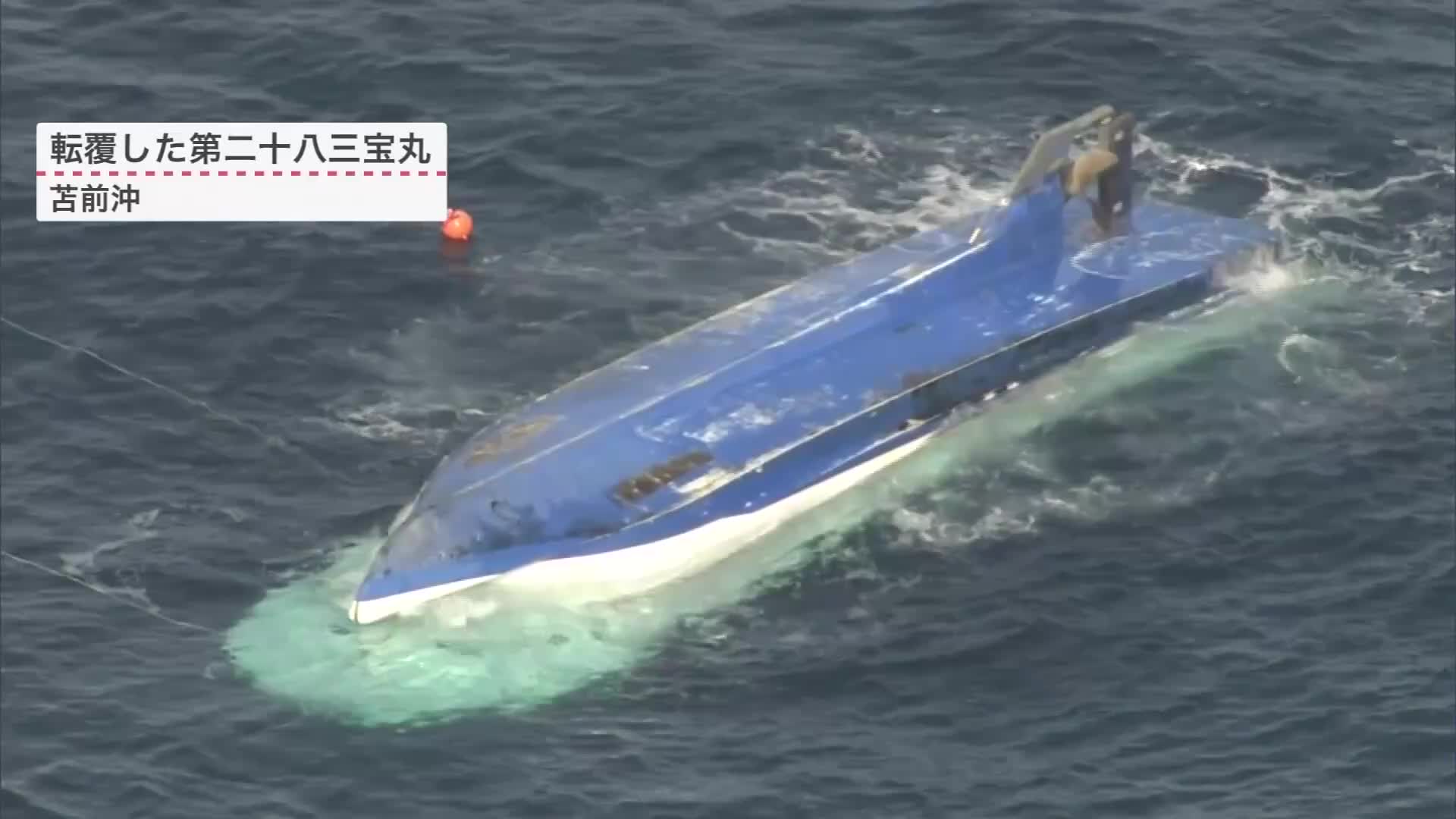 船底を上に浮かぶ漁船。周辺では別の船が捜索を続けています。