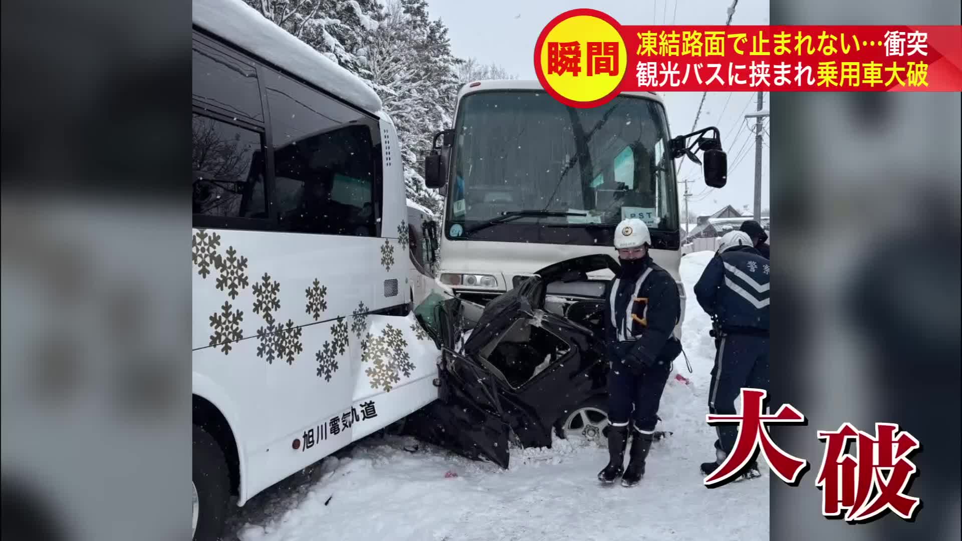 <カメラが捉えた“路面凍結”止まり切れず突っ込むバスと乗用車>旭山動物園近くで“10台以上”が絡む大事故…30代から60代ぐらいの男女4人が重軽傷―通行規制 3日ぶりに解除