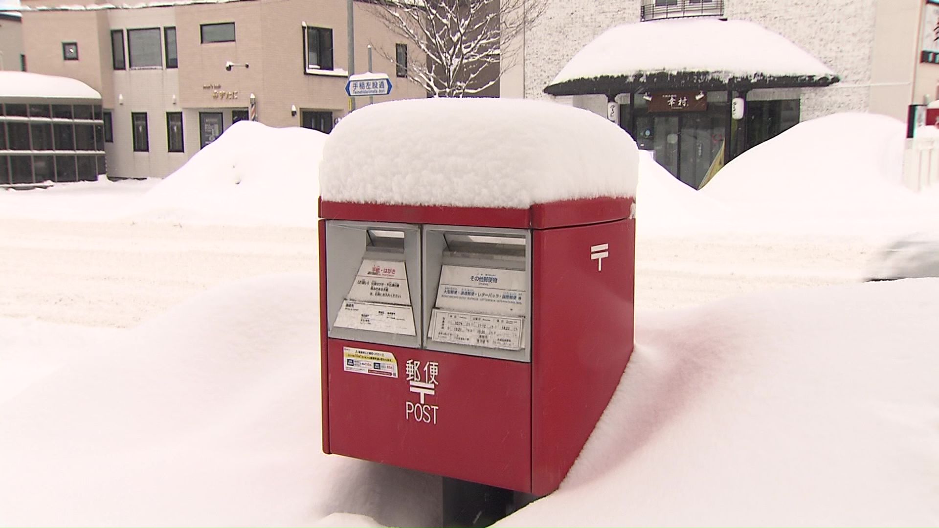 ポストの上にこんもりと積もった雪。