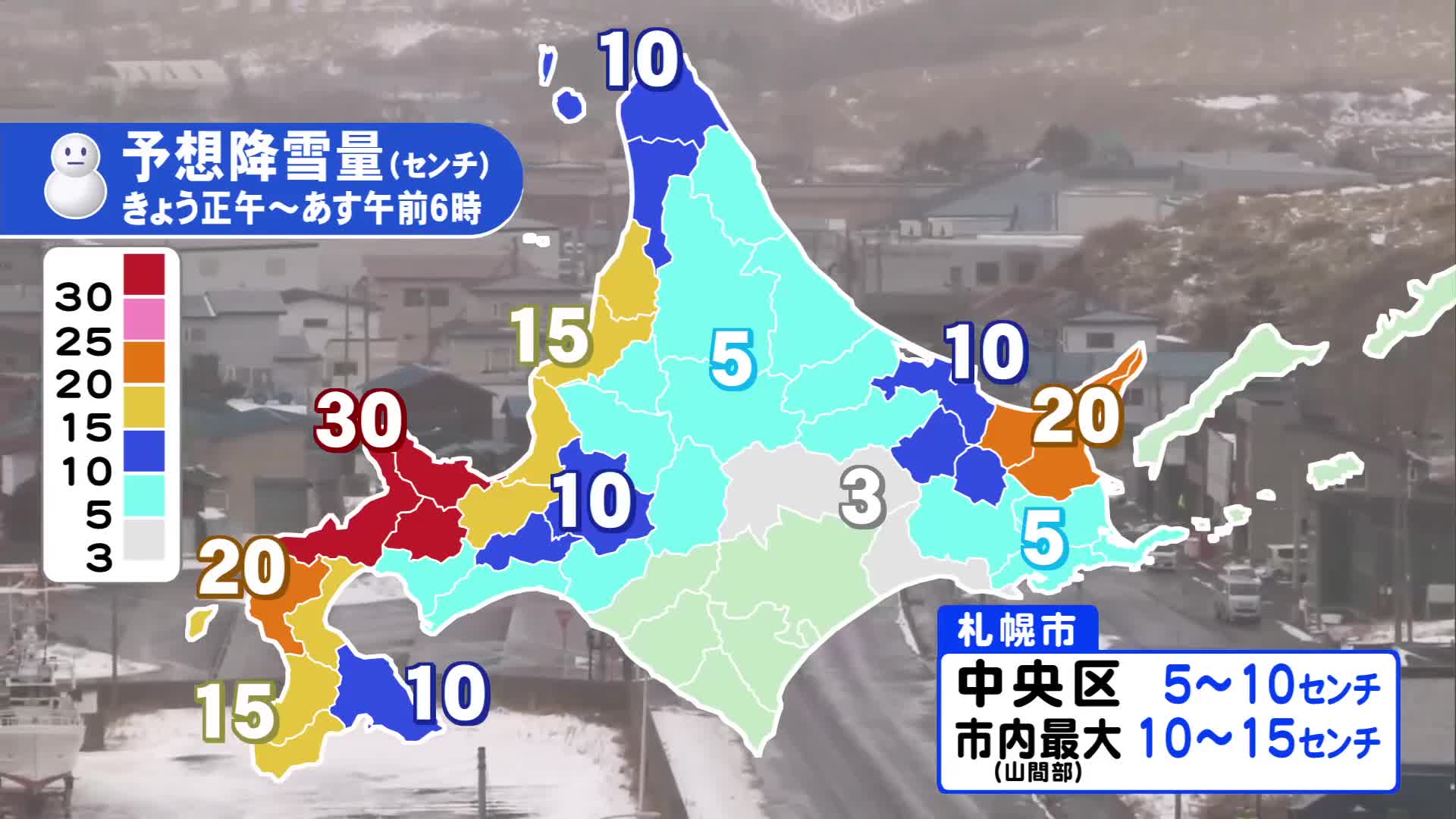 後志地方で最大30センチ、知床半島でも20センチの予想です。
