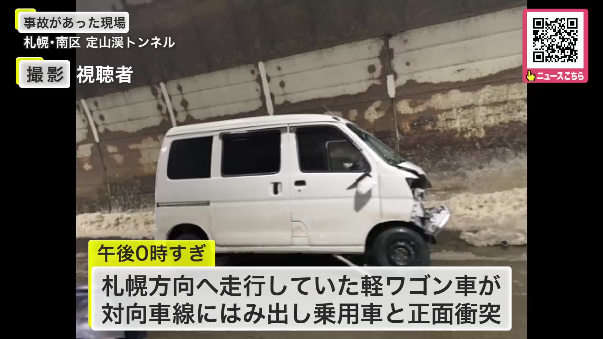 22日午後0時すぎ、札幌市南区の定山渓トンネル内で、札幌方向へ走っていた軽ワゴン車が対向車線にはみ出し、乗用車と正面衝突。