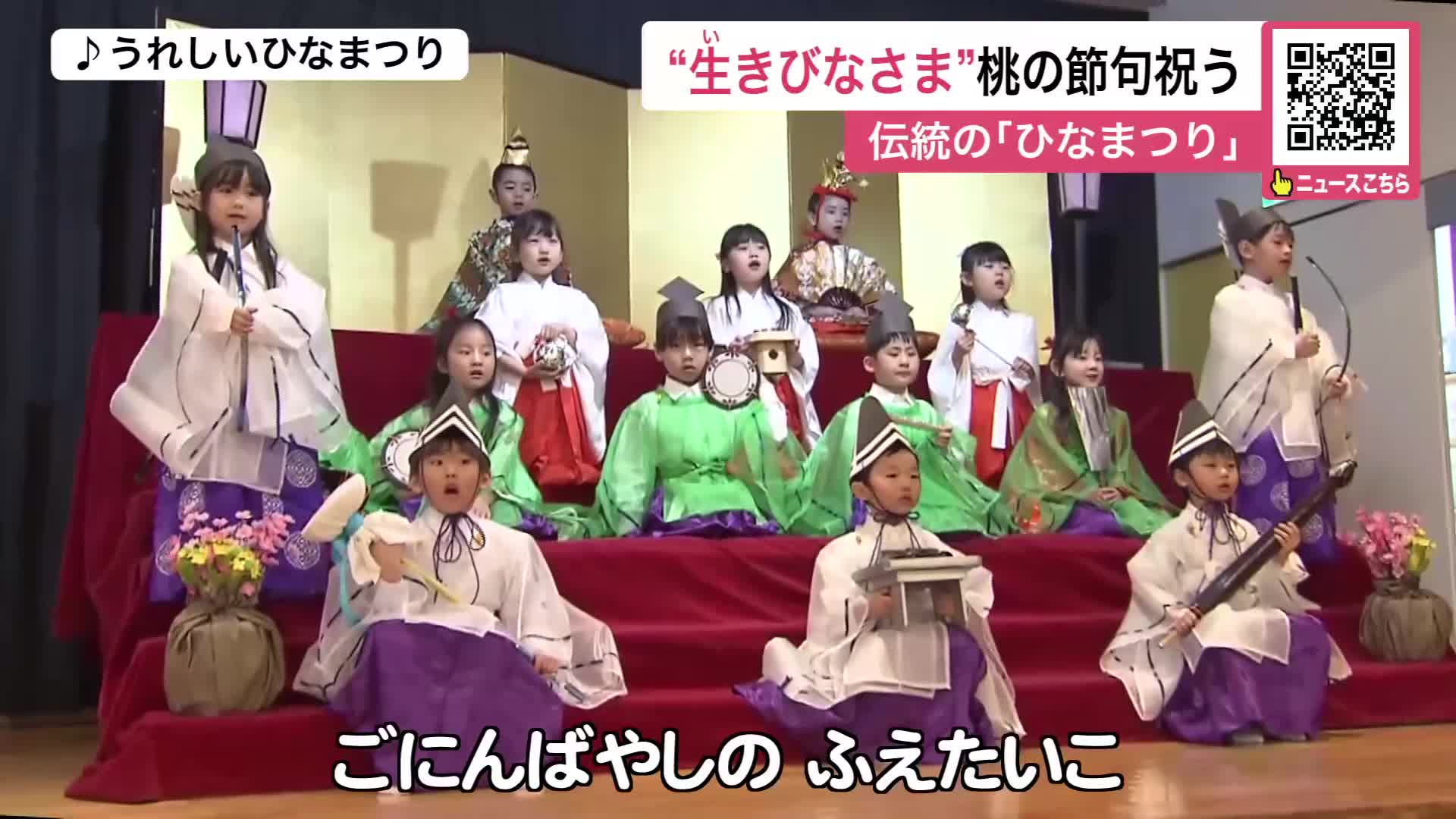 園児51人が「生(い)きびなさま」になり、桃の節句を祝いました。