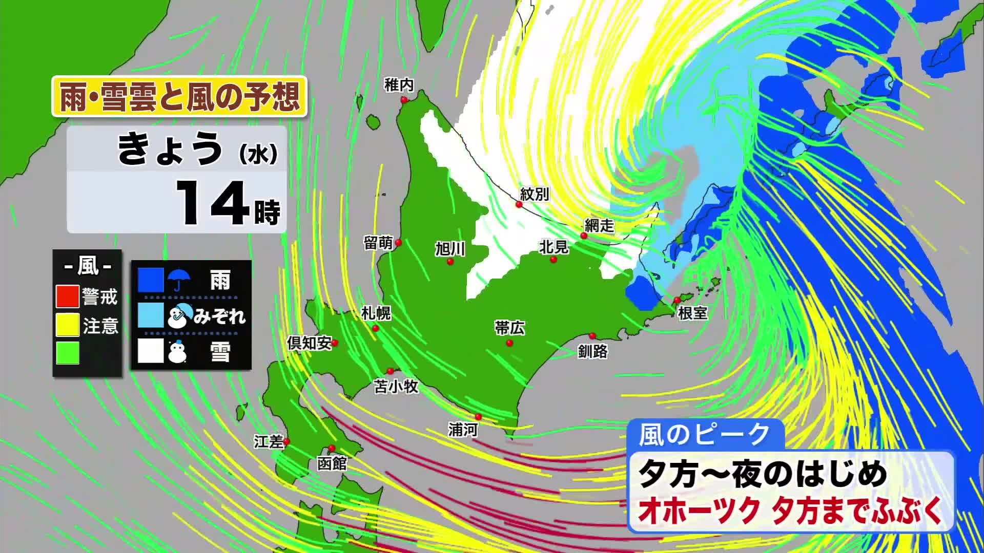 また、オホーツク海側は、夕方まで吹雪く予想で、着雪による停電にもご注意ください。