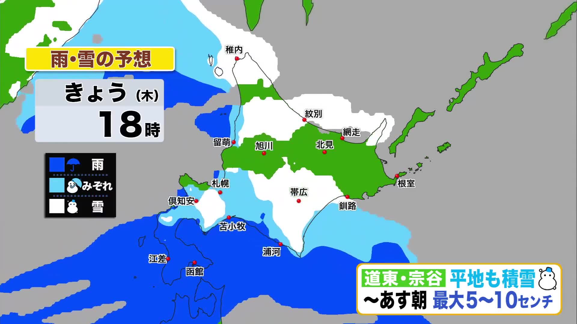 道東では、夕方以降、湿った雪が降り出し、夜は積もる所があるでしょう。