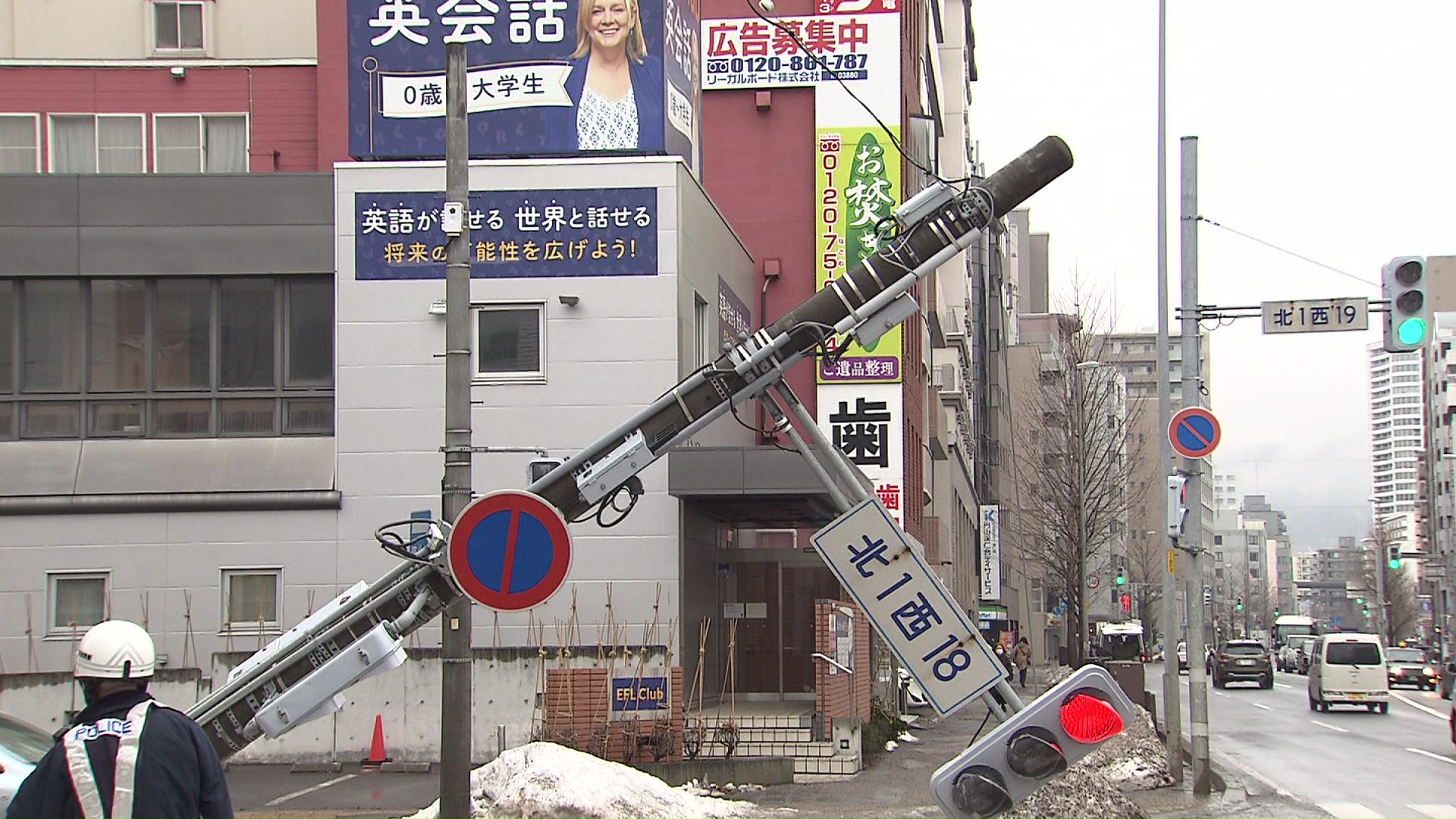 札幌市中央区の交差点で3月28日朝、信号機の柱にSUVが突っ込み、倒れた柱が歩道を塞ぎました。
