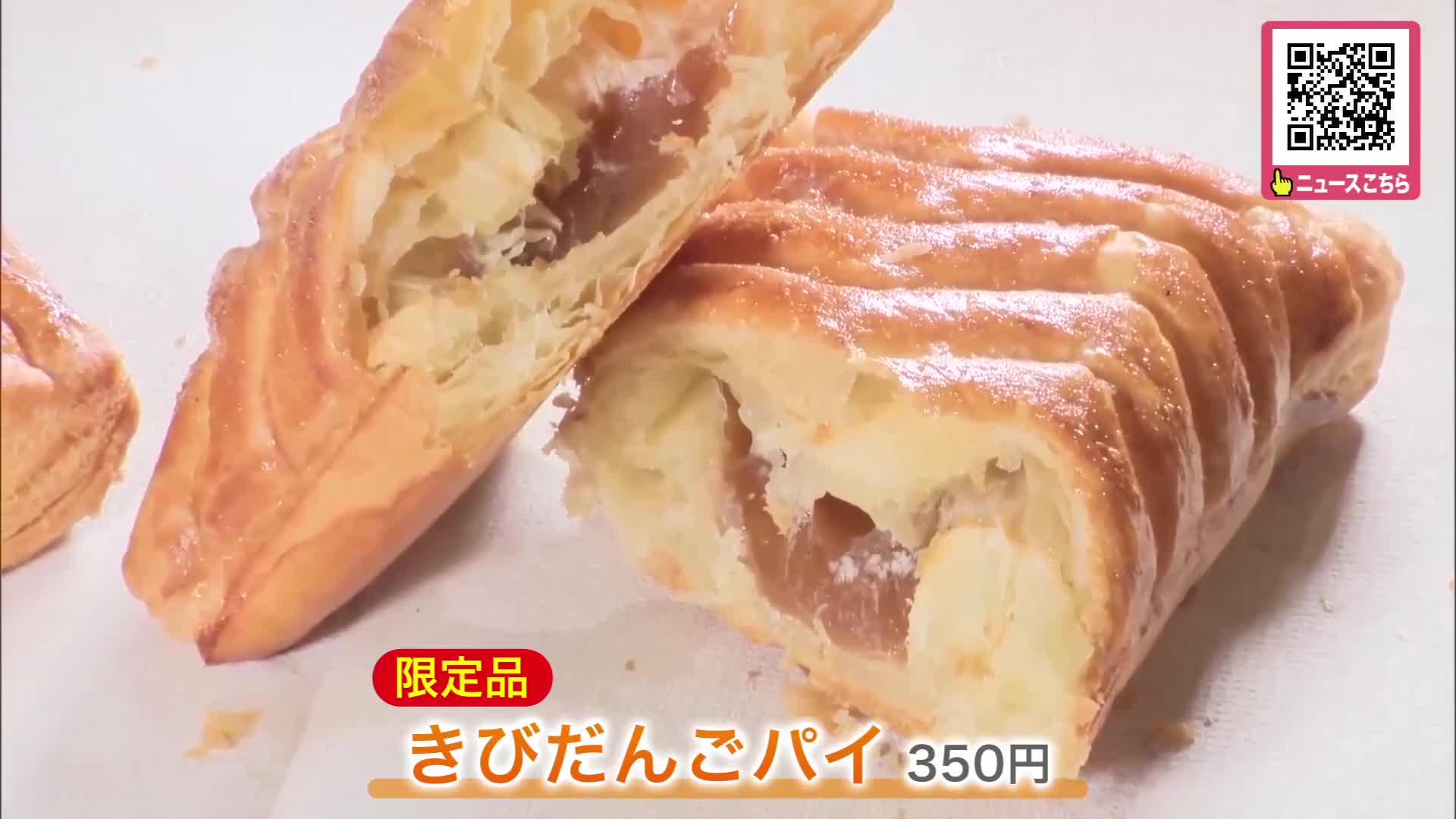 店内にはきびだんごや特産のリンゴの商品がそろい、中でもアップルパイときびだんごを組み合わせた限定品「きびだんごパイ」が人気を呼んでいました。