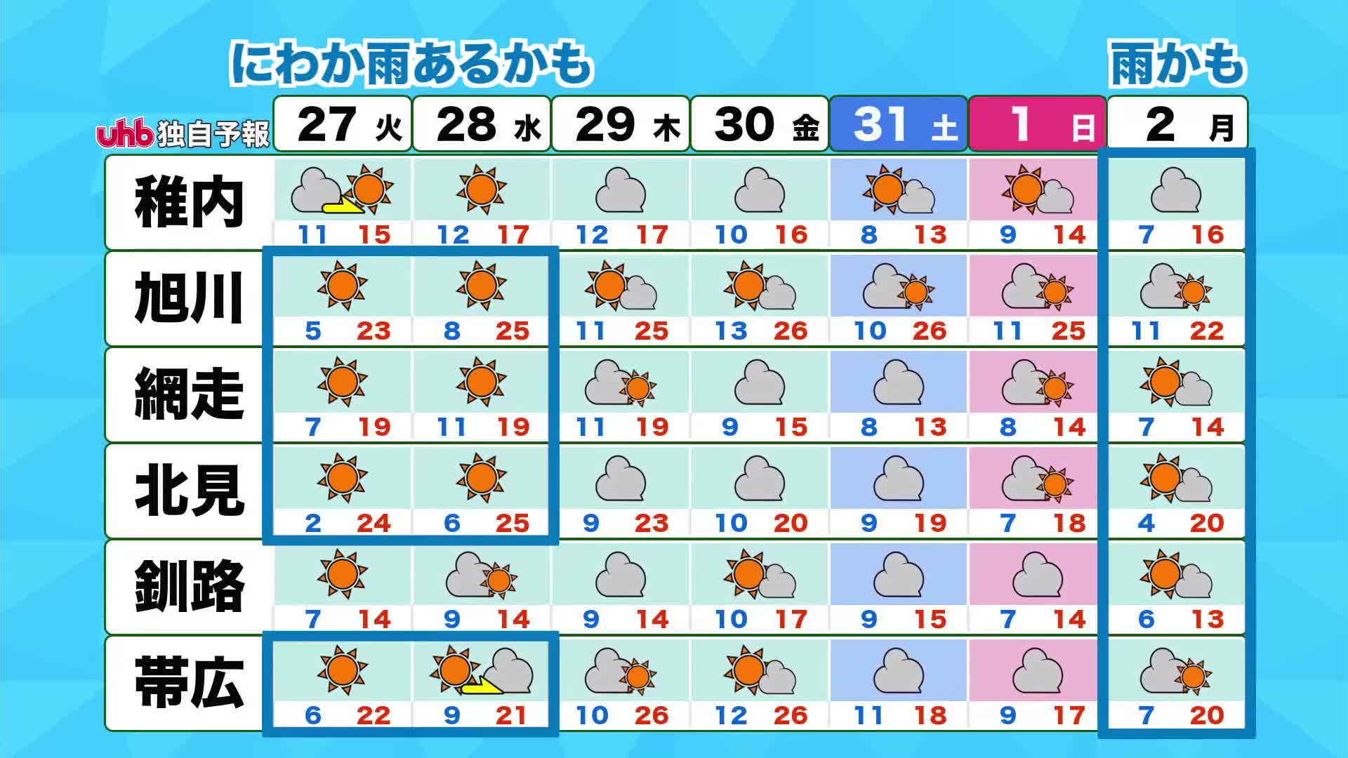 最高気温は札幌で22℃、旭川や富良野は23℃、北見は24℃です。