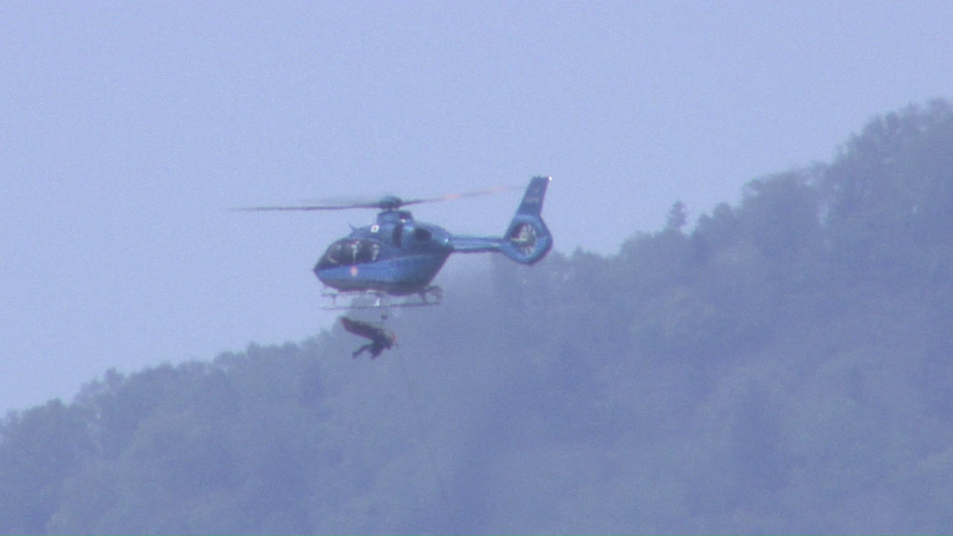 山頂付近でホバリングする救助ヘリ。