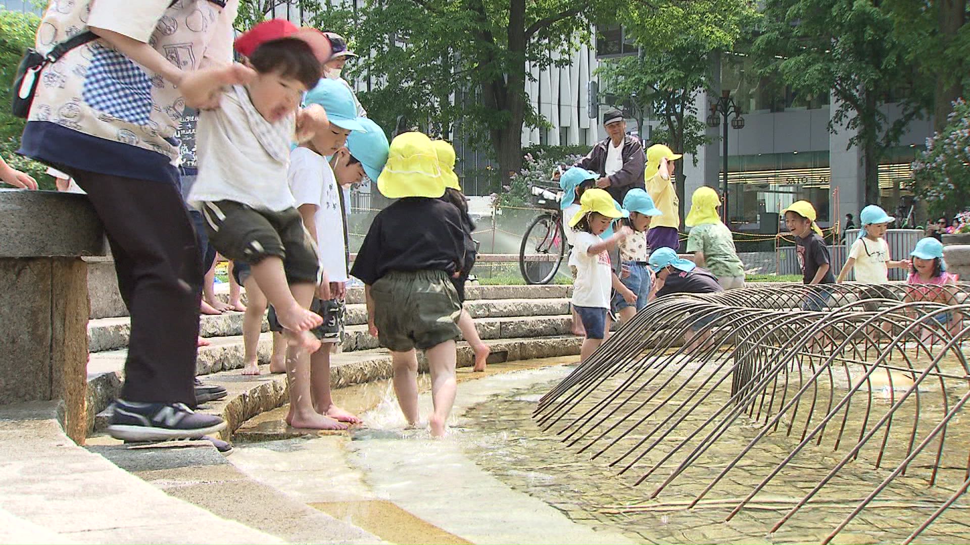 「焼けるような強い日差しの今日の札幌、噴水に入りたくなる暑さです」(川瀬雄也記者)