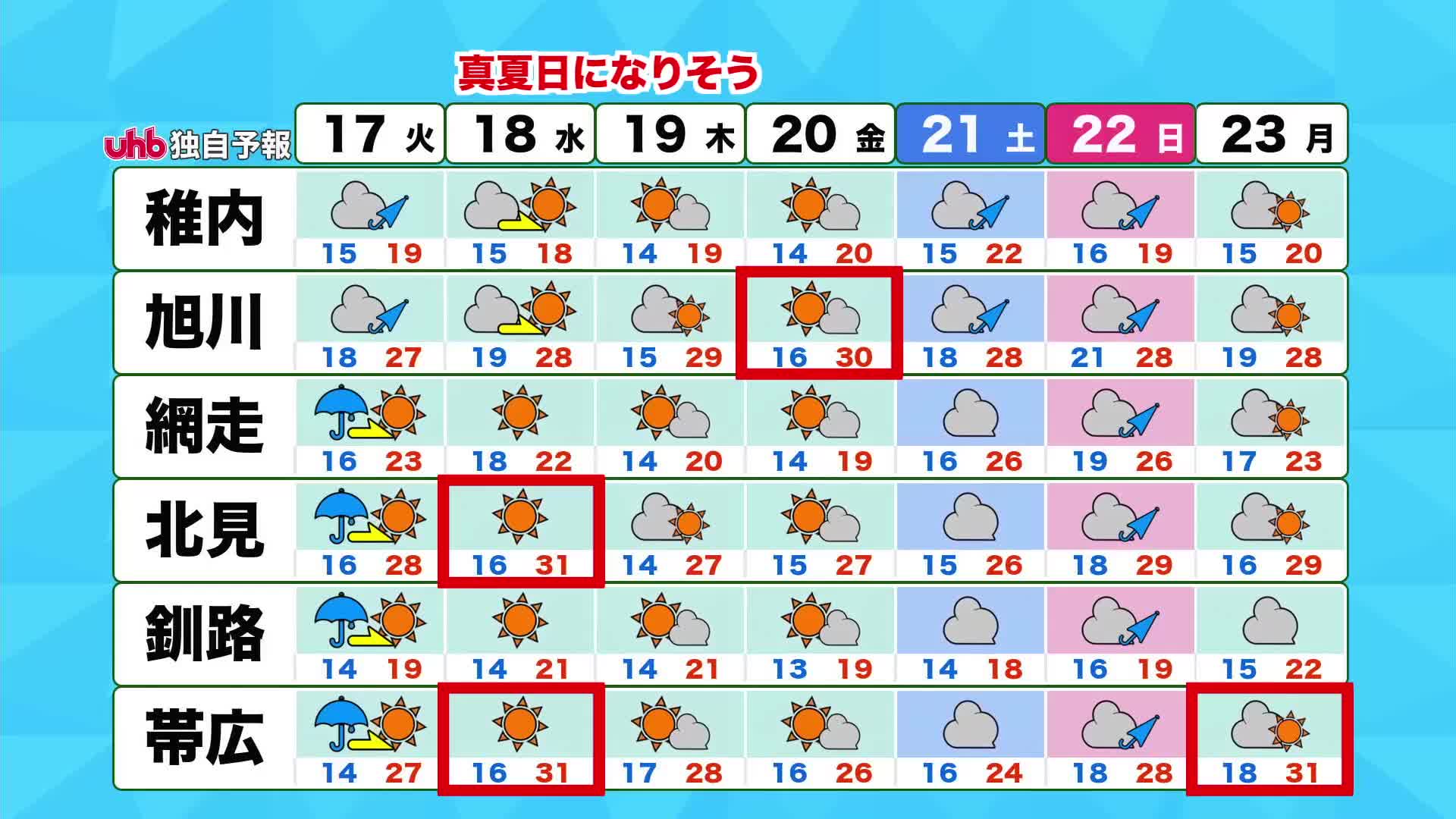 旭川、北見、帯広は気温が30℃以上の日もあり、