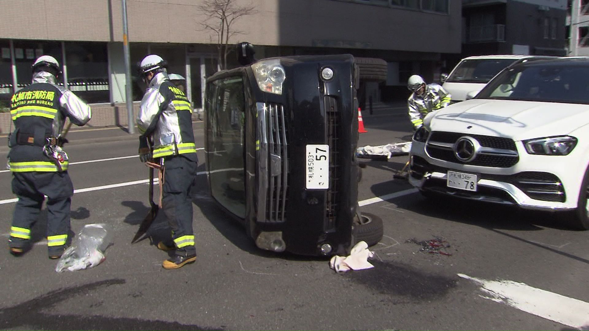 【交差点で4台絡みの事故】乗用車と軽乗用車が出合い頭に衝突…横転し対向車にもぶつかる_破片などが散乱“双方の運転手の男女”ケガ『赤信号』どちらかが見落としたか〈北海道札幌市中央区〉