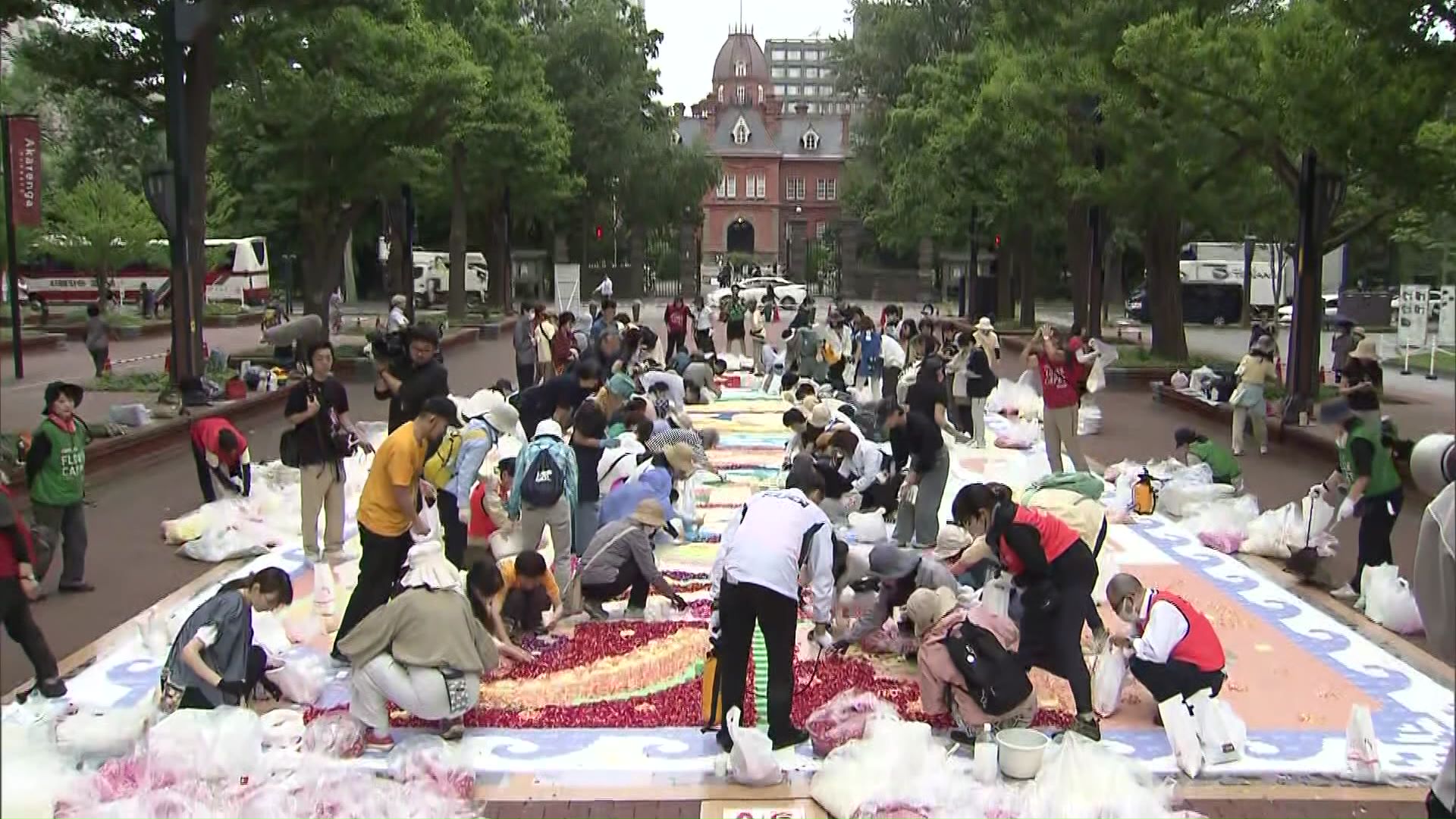 花びらなどをじゅうたんのように敷き詰めて巨大な絵を作りあげるイベントが札幌市で始まりました。