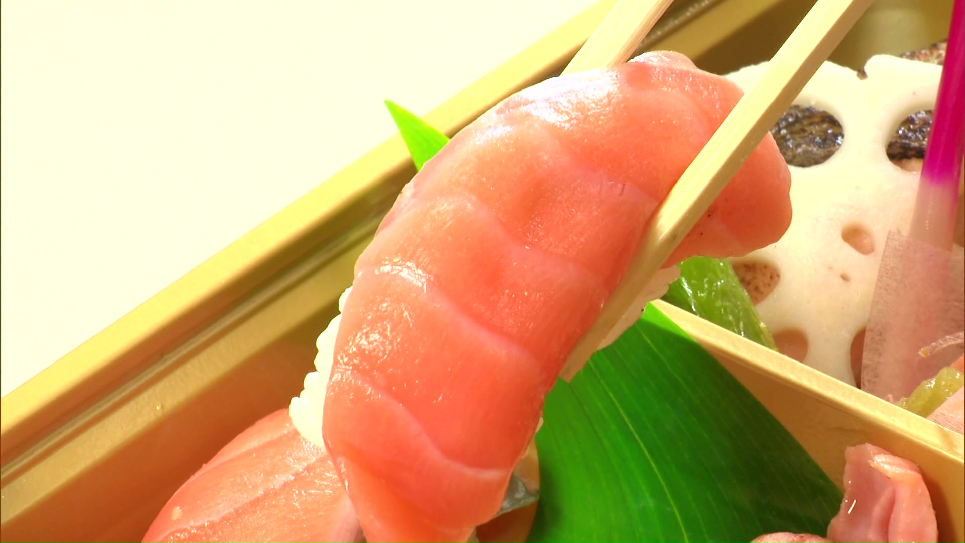 脂がのった刺身、寿司に塩焼き、そして揚げ物。キングサーモンをふんだんに使った弁当です。
