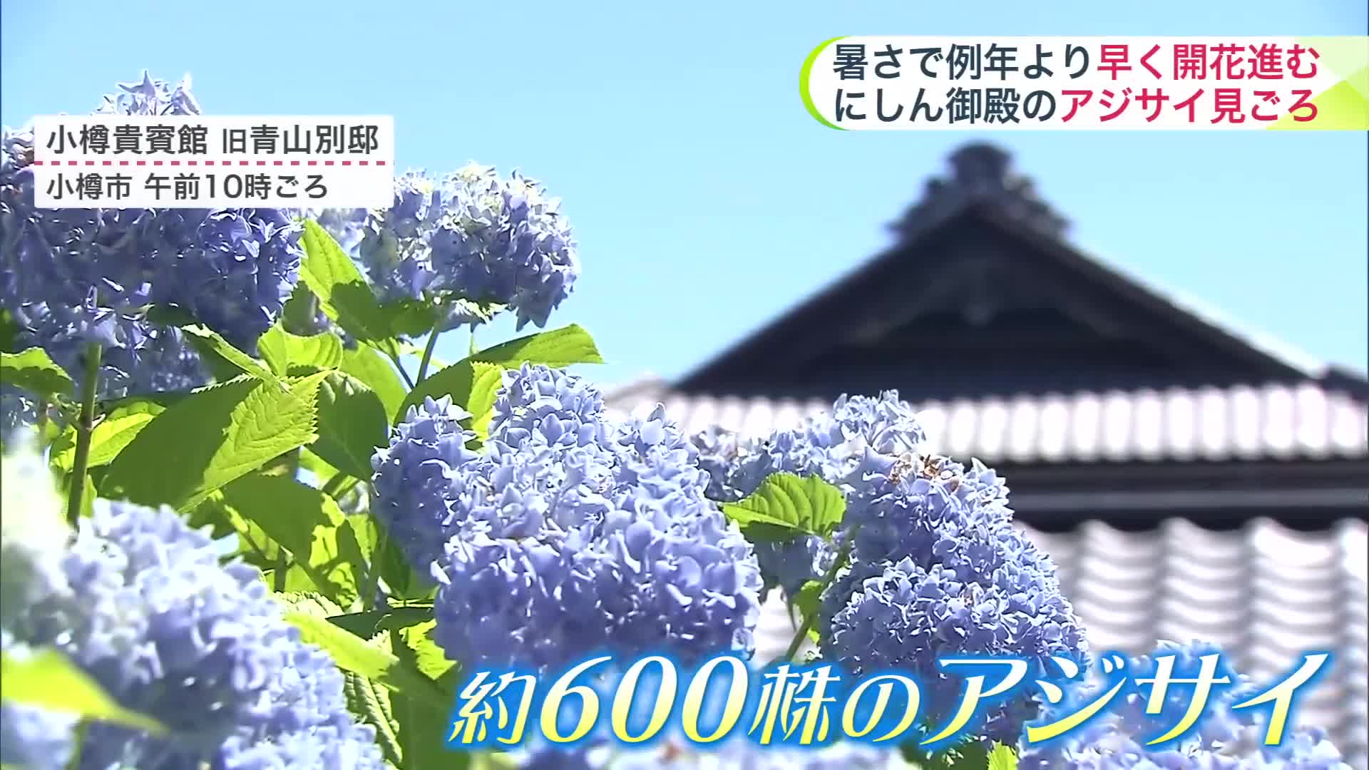 小樽市にある歴史的建造物、小樽貴賓館(旧青山別邸)のあじさい庭園では、約600株のアジサイが、色とりどりに咲き誇っています。