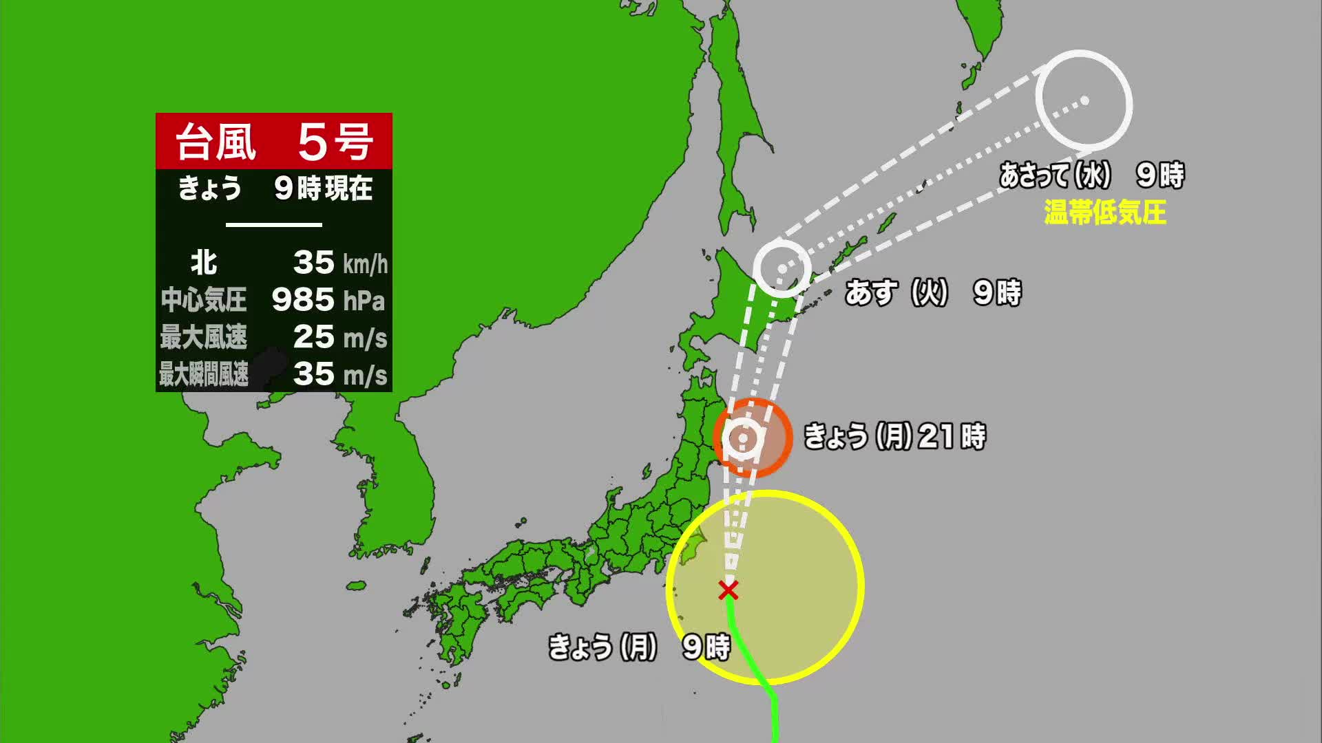 【9年ぶりに台風上陸か】台風5号が北上中!あす朝は北海道東部に上陸の可能性が高い…早めに高波・大雨・強風対策を【北海道の天気 14日(月)】
