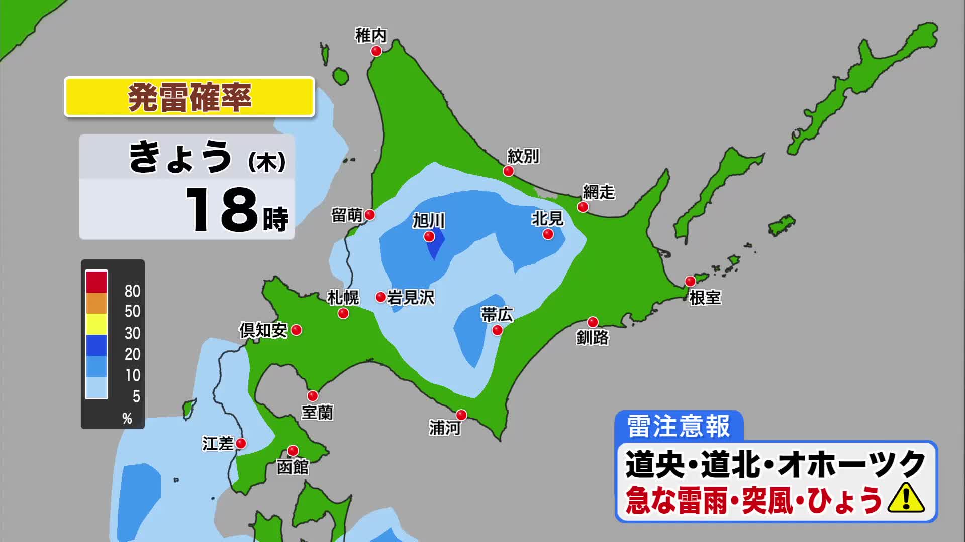 道央、道北、オホーツク海側に雷注意報が出されており、急な雷雨や突風、