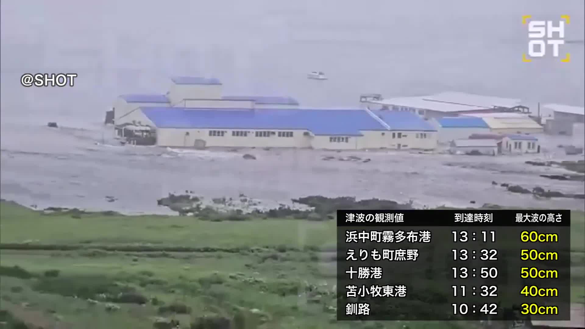 道内で観測された津波は、午後1時11分に浜中町霧多布で60センチを観測したほか、えりも町庶野で50センチ、十勝港、苫小牧東港、根室市花咲で40センチ、釧路、紋別港、枝幸港で30センチなどとなっています。