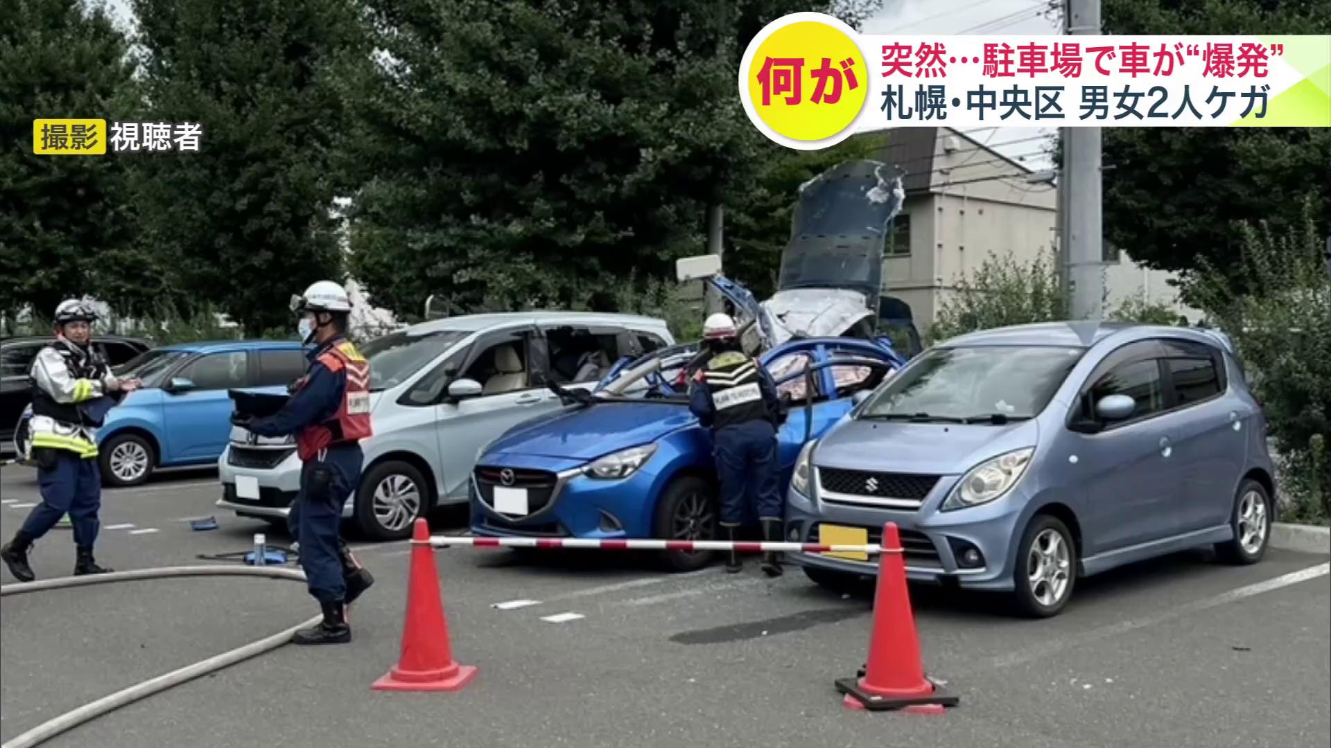 警察によりますと、爆発した車の運転手の40代男性と隣の車にいた30代女性がケガをし、2人は意識がある状態で病院に搬送されました。