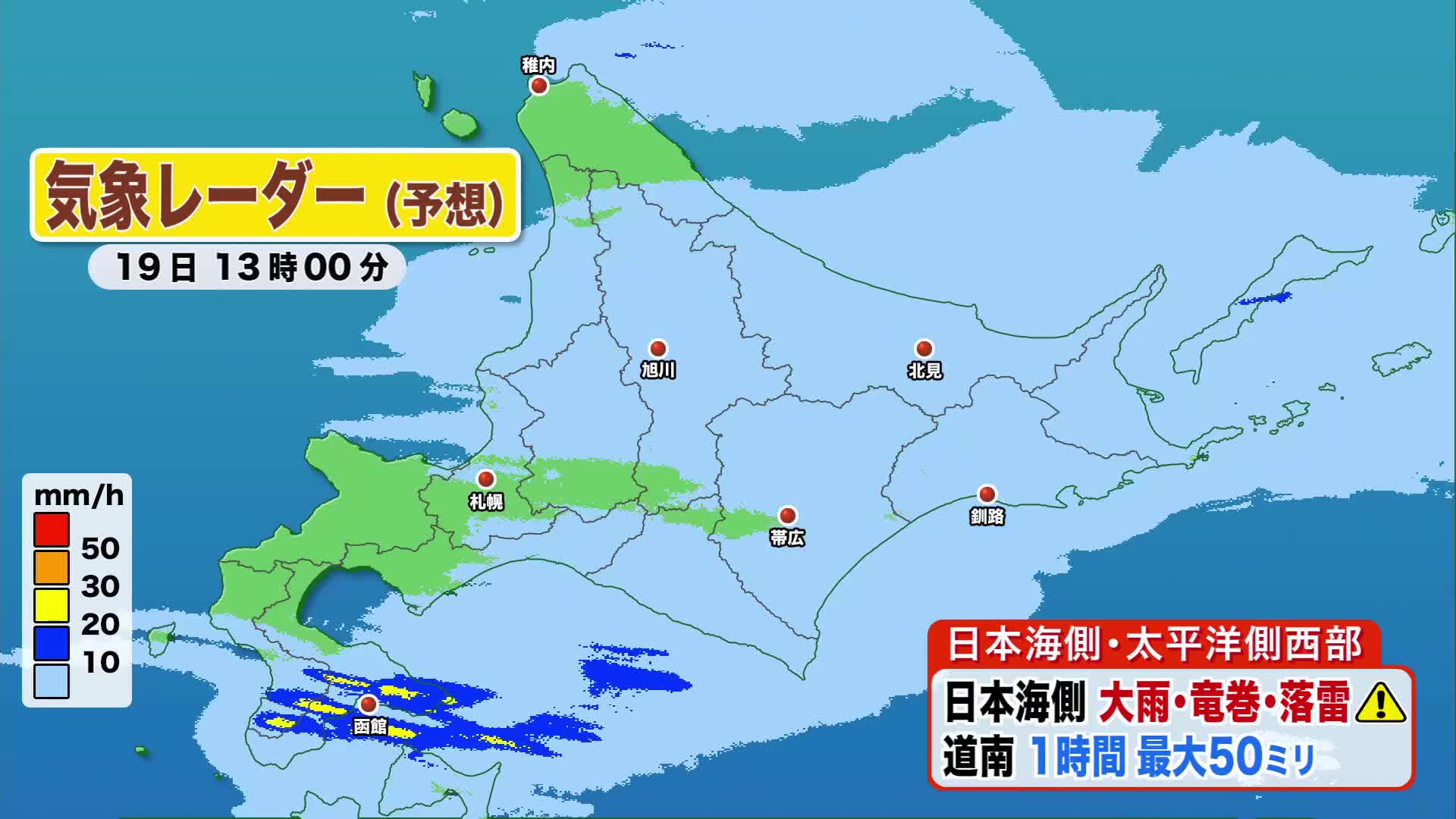 道南では1時間に最大50ミリと非常に激しい雨となるでしょう。