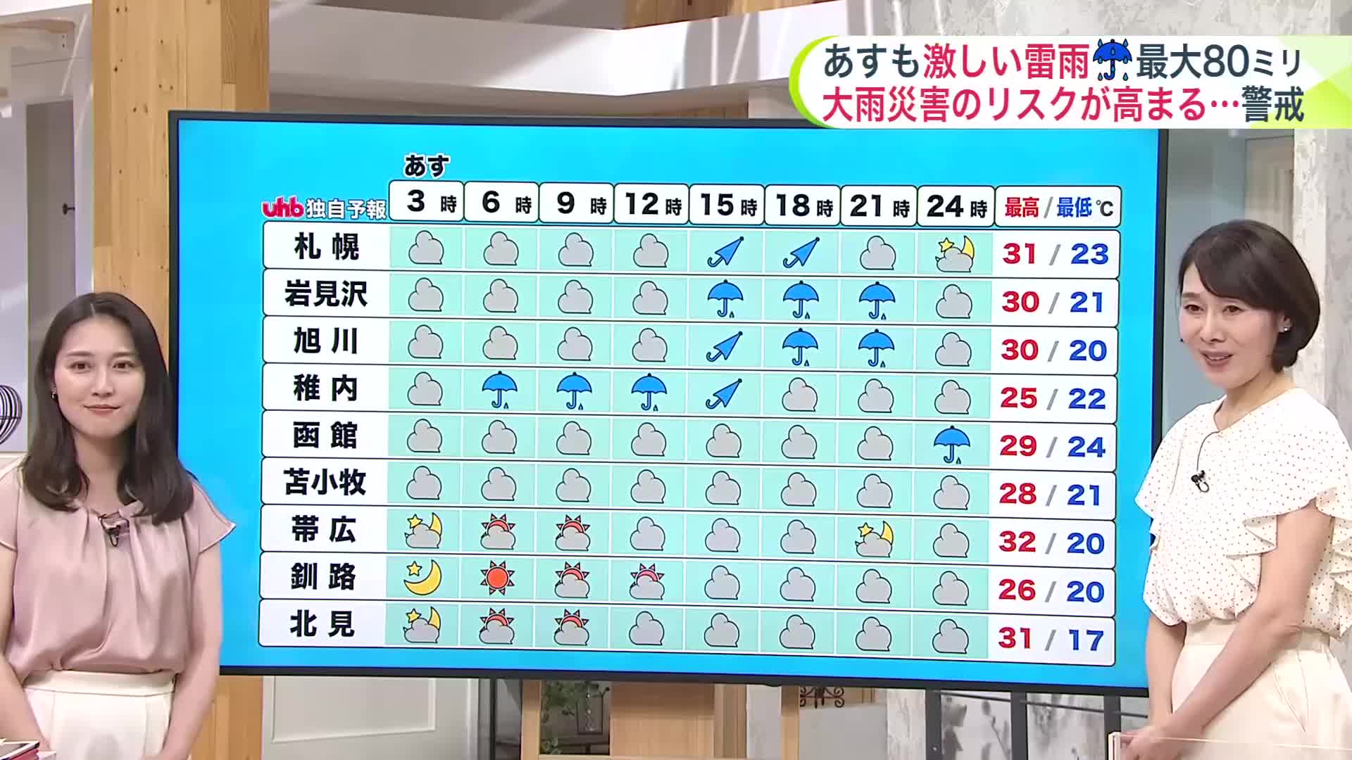 最高気温は、帯広32℃、札幌・北見31℃、旭川30℃です。