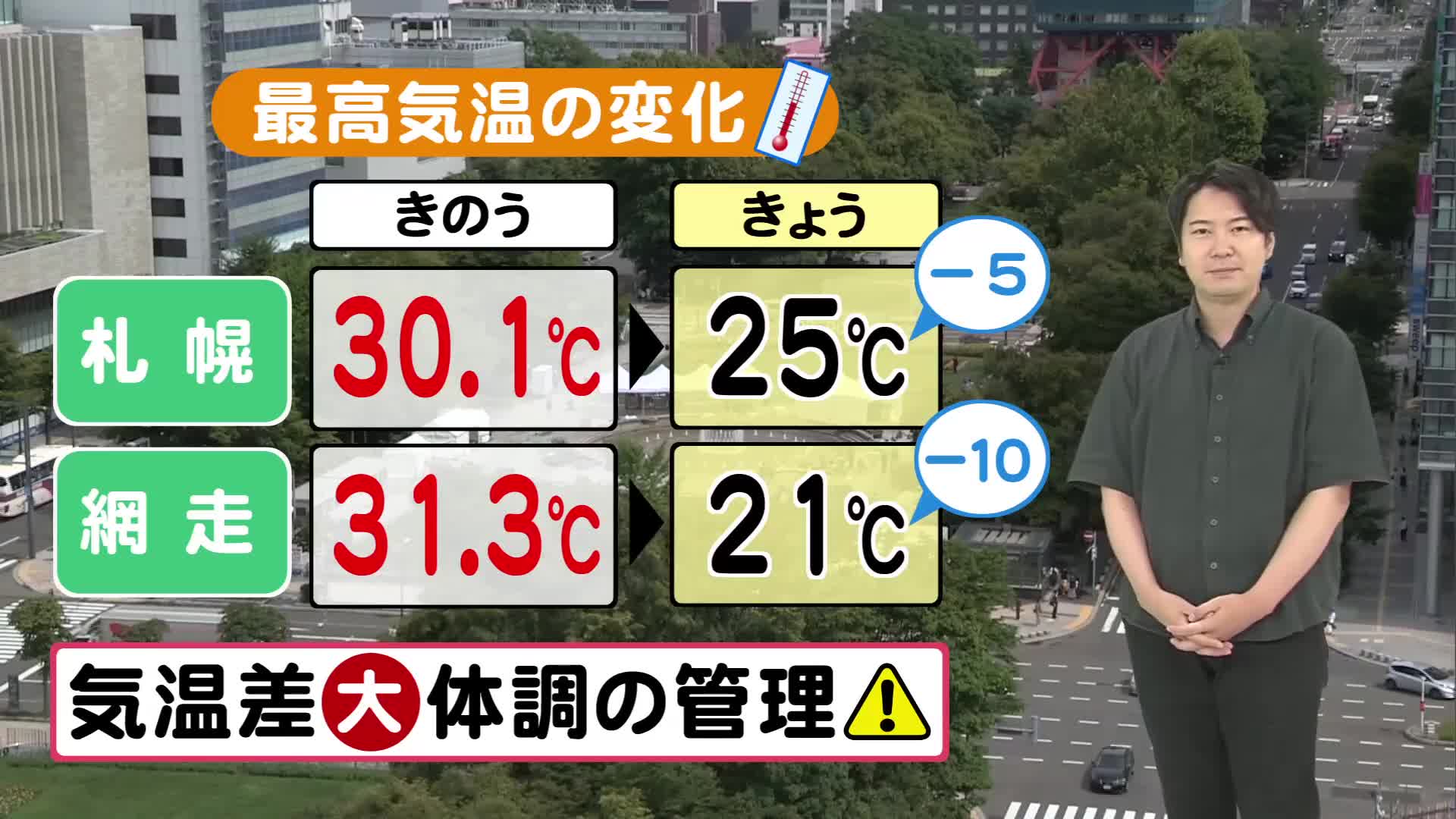 網走はきのう27日(水)は31.3℃でしたが、きょう28日(木)は21℃と10℃も低くなります。