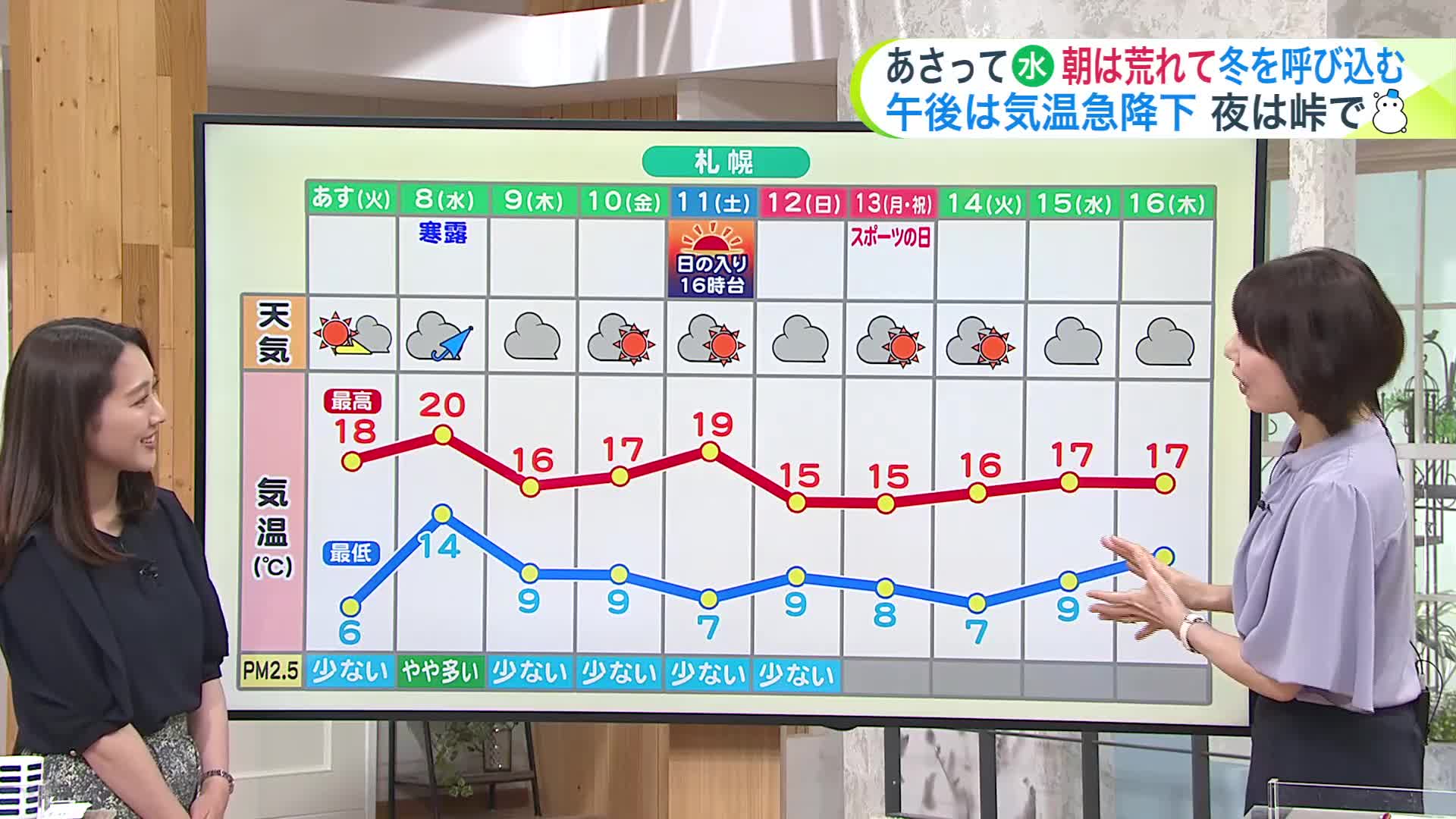 最低気温は、札幌6℃、旭川2℃のほか、
