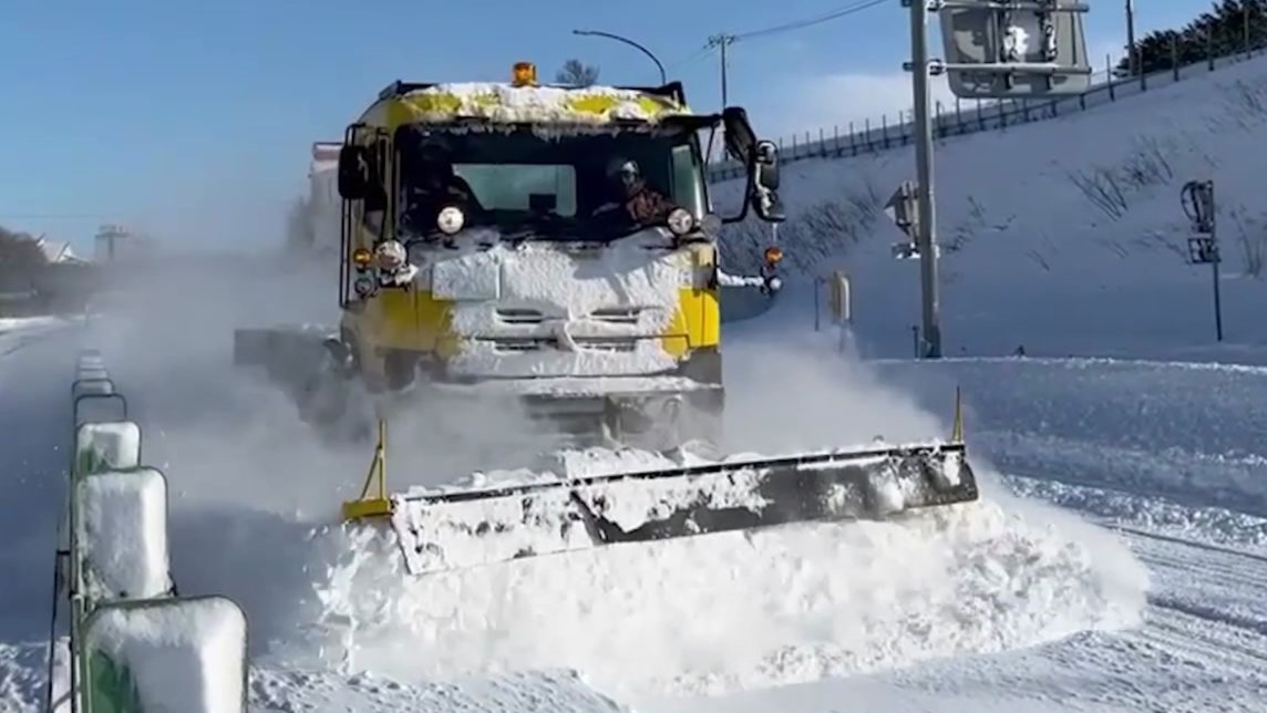通常の除雪作業は除雪トラック3台と標識車1台を組み合わせ、時速50キロ以下の低速で行うため、ドライバーに追い越しせず車間距離を十分に保つよう呼びかけています。