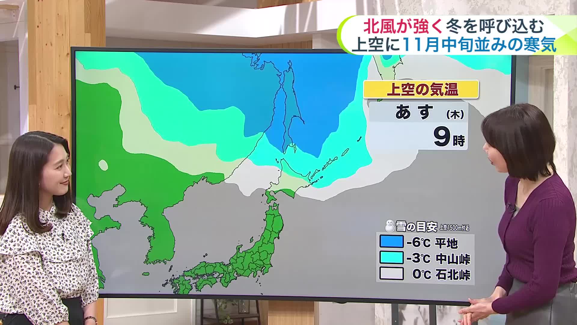 上空には、今季一番の強い寒気が流れこむため、標高の高い所は雪が降りそうです。