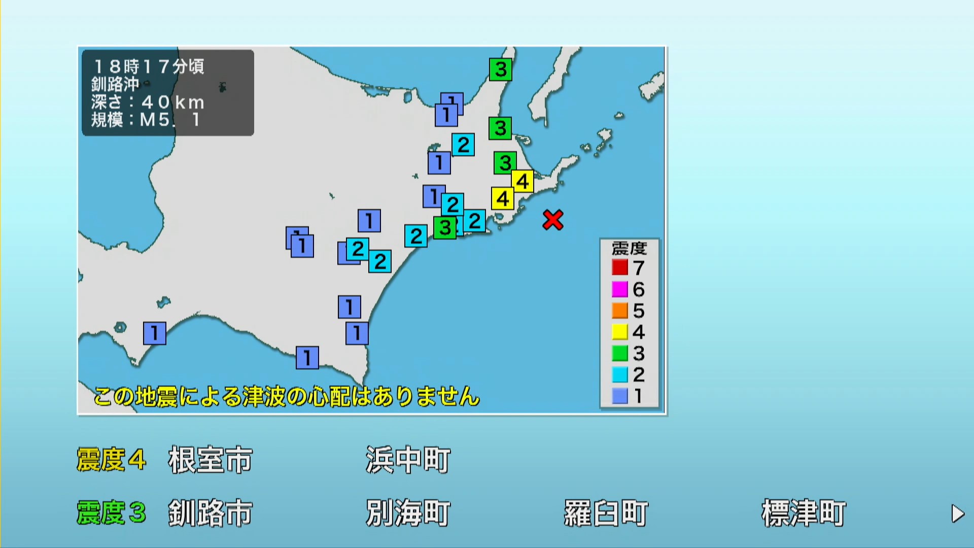 震度3を観測したのは、浜中町、釧路市、根室市、標津町、羅臼町、別海町です。