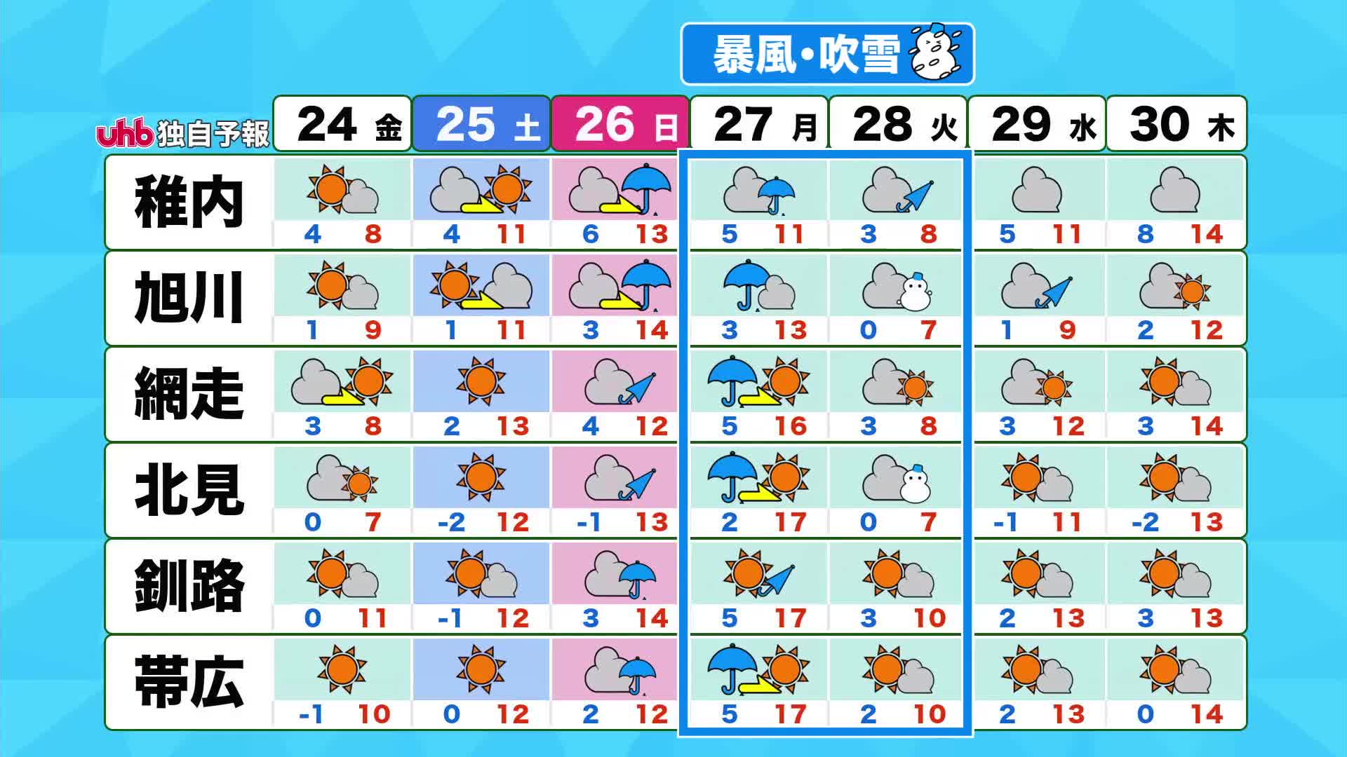 低気圧が通過するため、全道的に天気が崩れそうです。